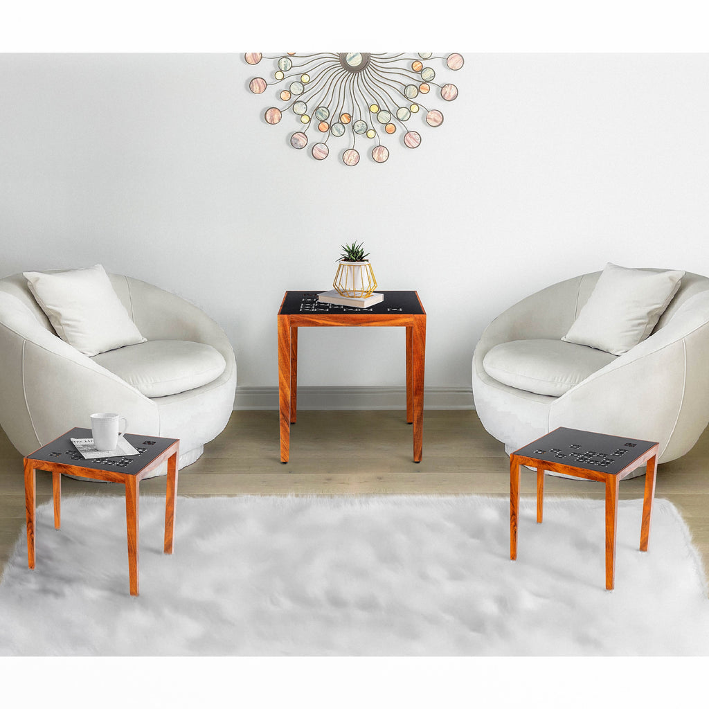 Contemporary design meets quality craftsmanship with this three piece handcrafted metal nesting table set from the Alba collection. The rust resistant black powder coated square metal tops depict unique laser cut celtic star accent designs for a touch of personality and character. Each table is supported on high quality acacia wood legs with added floor protectors to prevent abrasion and scratches. This unique nesting table set will bring art and functionality to your home social space, becoming a conversation piece at your next party or occasion. Usefule as a coffee table, end table, or even as spare dining tables during family get togethers.