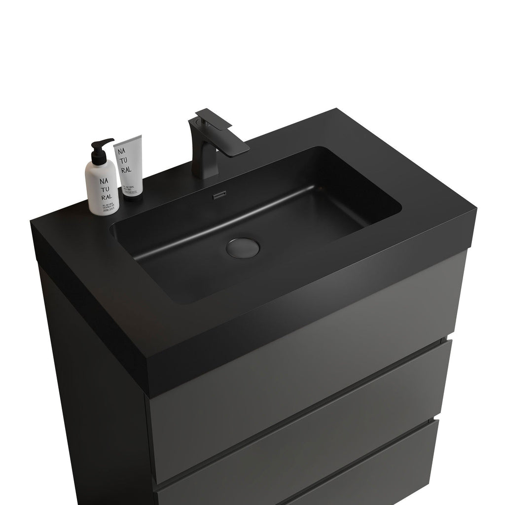 [Sleek modern look], [Maximized storage], [Silent and smooth operation], [Minimalist handle-free design], [Eco-friendly construction] Step into a realm of refined sophistication with our Alice minimalist bathroom vanity. Designed to elevate your bathroom experience, Alice seamlessly combines contemporary aesthetics with intelligent functionality. Crafted with meticulous attention to detail, Alice features a sleek and stylish matt black basin made of engineered stone, exuding an aura of understated luxury. The striking gray finish adds a touch of modernity, effortlessly complementing any bathroom decor. But Alice is more than just a visually stunning piece—it's a storage powerhouse. With three thoughtfully designed drawers, this freestanding vanity maximizes your storage capacity by an impressive 20%. Say goodbye to cluttered countertops and hello to a perfectly organized sanctuary. Experience the whisper-quiet elegance of Alice, thanks to its soft-closing silent drawer runners. Every glide is a testament to our commitment to your tranquility. The integrated 45° beveled handle-free design on the drawers further enhances its sleek appearance, providing a seamless aesthetic that radiates minimalist charm. Rest easy knowing that Alice is crafted from E1 grade environmentally friendly boards. We believe in sustainable practices, and Alice embodies our dedication to both style and eco-consciousness. Transform your bathroom into a haven of contemporary beauty and unparalleled functionality with Alice minimalist bathroom vanity. Discover the perfect balance of form and function, and indulge in the essence of modern elegance.