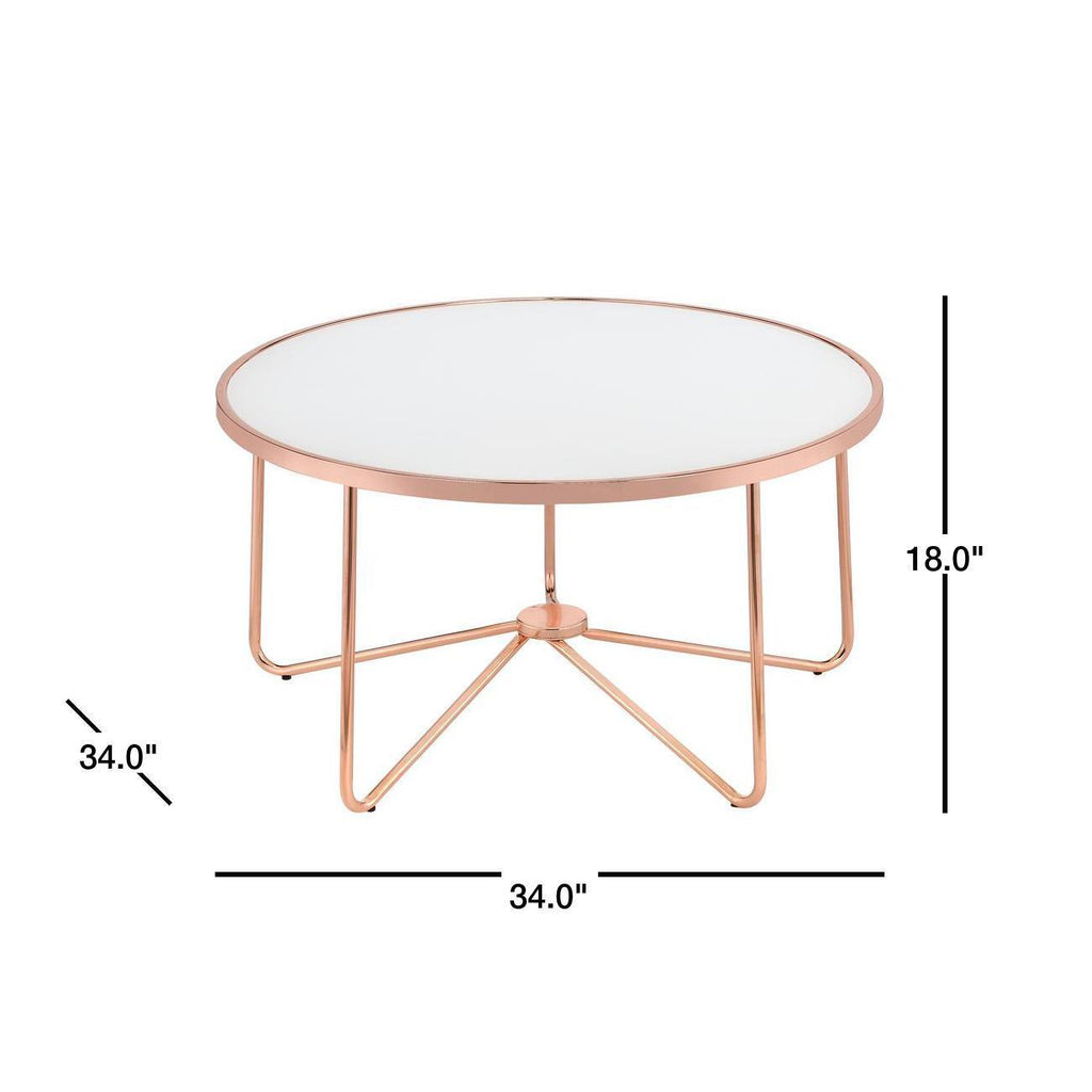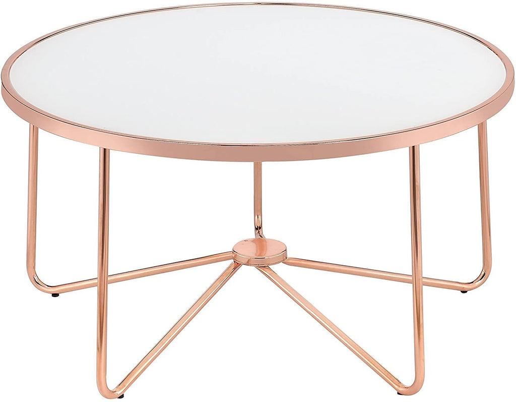 This Alivia modern occasional table brings a unique yet classy look to your living room. With effortless infusion of frosted glass and unique retro inspired rose gold metal base, this piece will naturally blend in your living room, making it a statement of any room decor.