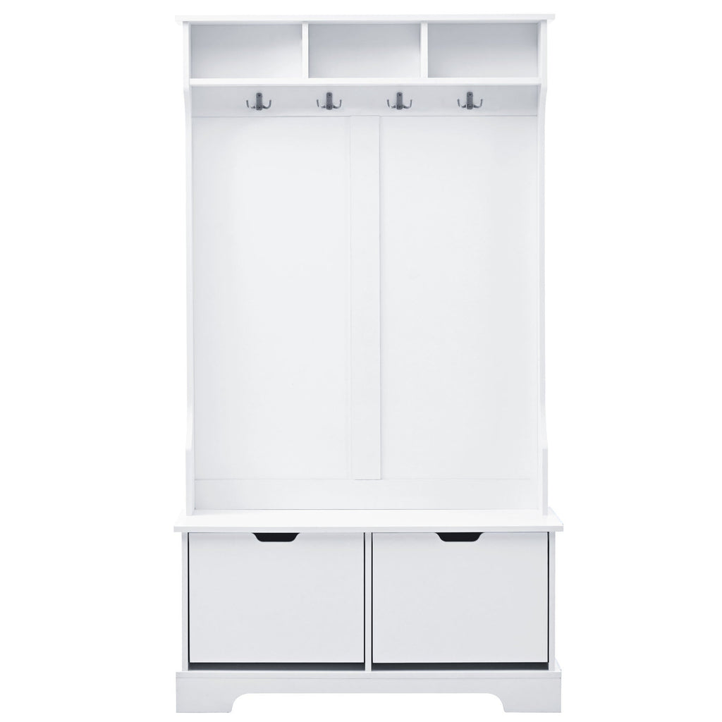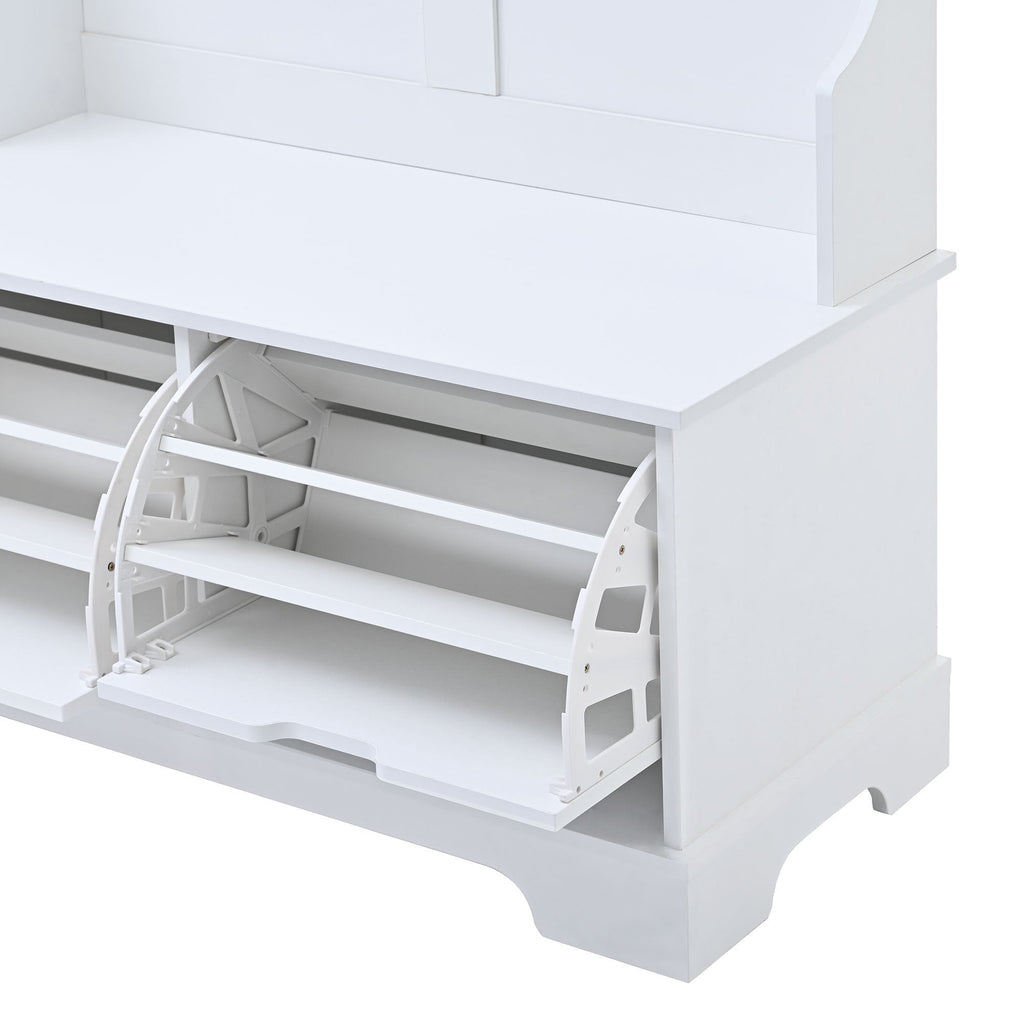 All in One Hall Tree with 3 Top Shelves and 2 Flip Shoe Storage Drawers, Wood Hallway Organizer with Storage Bench and Metal Hanging Hooks, White