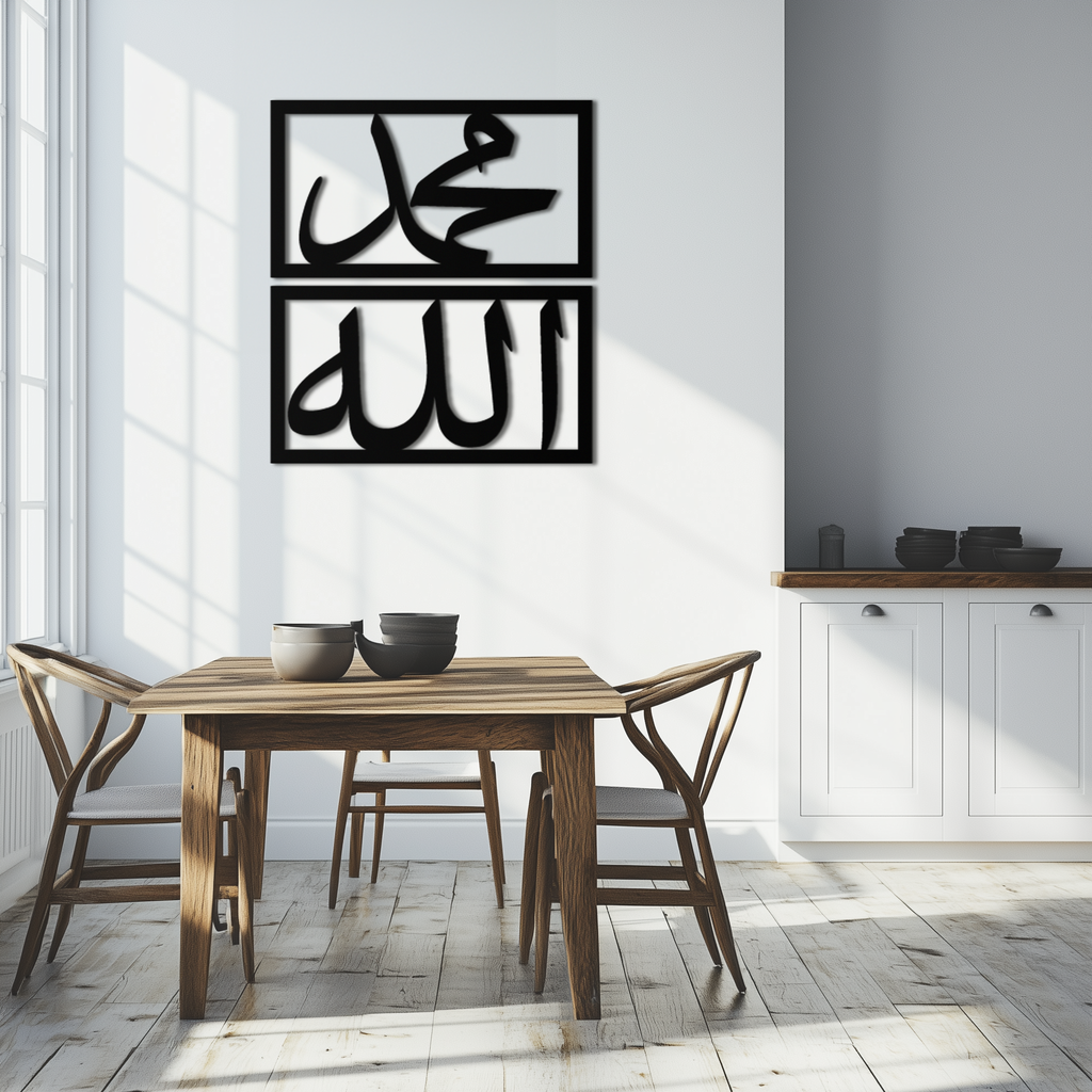 Elevate your home decor with this Allah & Muhammad Metal Wall Art, a stunning representation of Islamic calligraphy. This beautifully crafted piece features "Allah" and "Muhammad", symbolizing the core of Islamic faith. Designed to inspire peace and spirituality, this elegant wall decor is perfect for living rooms, prayer rooms, offices, or as a meaningful gift.