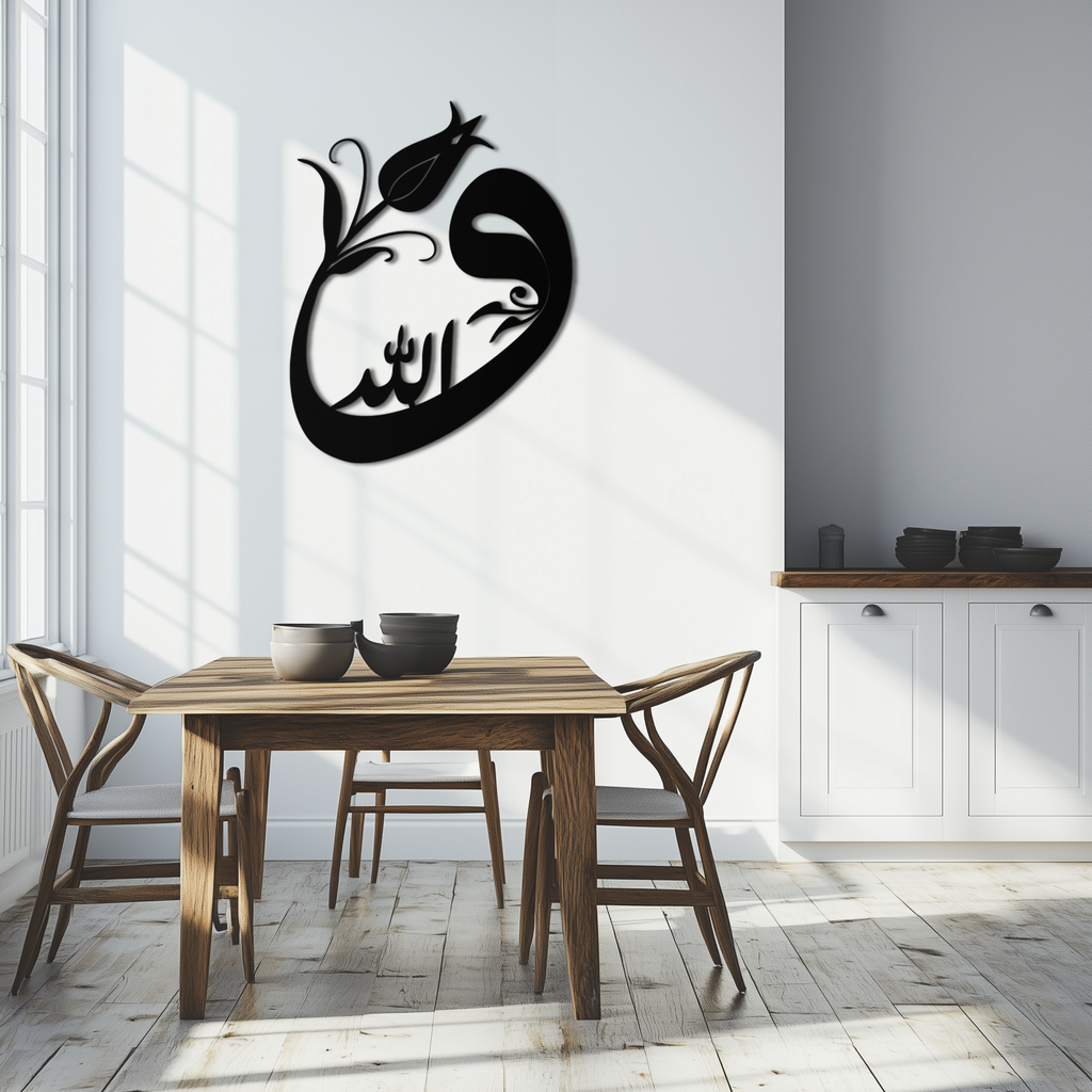 Enhance your space with the divine elegance of the Allah-Vav Calligraphy Metal Wall Art, a beautifully crafted Islamic décor piece that seamlessly blends spirituality and artistry. This striking metal wall piece features the calligraphic representation of Allah in the shape of the Arabic letter "Vav," symbolizing humility, servitude, and devotion.