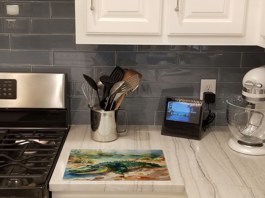 Decorate your space with our Alligator artwork on a Cutting Board. Introduce your kitchen to the vibrant, large Decorative Glass Cutting Board from Caroline's Treasures. Crafted from resilient tempered glass, this board is not only a utilitarian necessity but also a colorful art piece. With its generous dimensions of 15 inches in height and 12 inches in length, it offers ample space for all your cutting needs. Every piece showcases captivating artwork from distinguished artists, bringing an aesthetic edge to your kitchen. Beyond its attractive design, this cutting board ensures your countertop stays pristine and unscathed, owing to its heat-resistant properties. Engineered with user convenience in mind, it features non-skid feet for stability, and rounded corners for additional safety. Its robust construction renders it virtually unbreakable, guaranteeing longevity. The board comes with protective feet bumpers, maintaining its position during use. This product is recommended to be hand washed only. Proudly printed and assembled in the United States, this cutting board exemplifies superior craftsmanship. With Caroline's Treasures' Decorative Glass Cutting Board, you're investing in a blend of functionality and artistic flair.