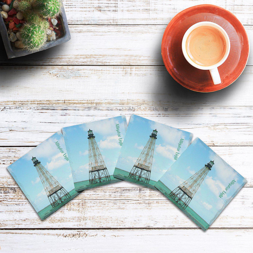 This beautiful set of (4) absorbent ridged ceramic coasters with the beautiful Alligator Light, Florida design is the perfect addition to your home and makes for a great housewarming gift, birthday gift, or wedding gift!