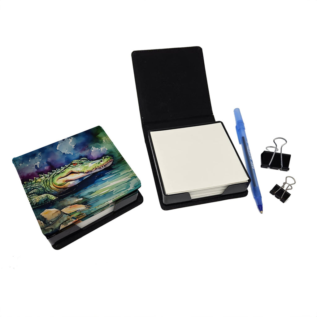 PU Leather Note Paper Holder featuring breed specific Alligator artwork. Elevate your workspace with this PU Leather Note Paper Holder, crafted to resemble luxurious leather without the use of animal products. Made from durable synthetic PU leather, it offers both a premium look and eco-friendly appeal. This note holder, compactly sized at 4.25 x 4.25 x 1.25 inches, includes about 160 sheets of 3.75 x 3.75-inch note paper—ideal for quick notes and reminders. An exclusive artist-designed cover makes each holder uniquely vibrant, adding a splash of color and personality to any desk or office. The discrete design keeps note paper hidden, maintaining a neat and organized workspace. Perfect as a gift or for personal use, this stylish holder is refillable with standard paper, ensuring long-lasting utility. A must-have for anyone seeking a sophisticated, artful touch to their workspace while supporting animal-friendly products. Add style, organization, and creativity to your everyday routine with this elegant note paper holder.