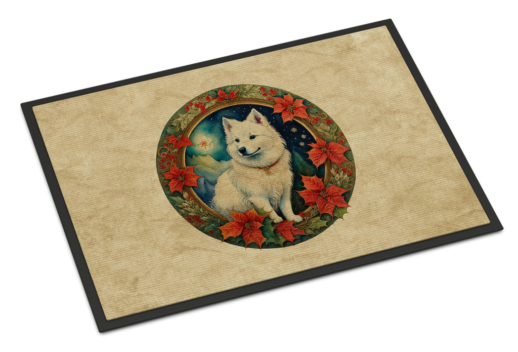 Decorate your space with our Christmas American Eskimo artwork on a Doormat. Bring a bit of Winter into your home with a Winter Doormat. Welcome your guests in style with our Artwork Door Mat, designed to withstand almost any weather condition. This mat, measuring approximately 18 by 27 inches, is held together by durable black binding tape. Its top layer, composed of polyester felt, is dyed with the eye-catching image you see on the mat. A few layers below provide the mat with stability, while its rubber bottom is stamped to help prevent slipping and ensures safety. Our mat works wonderfully as both an indoor or outdoor door mat. For cleaning, simply hose it off with water or use a power washer - no need for any cleaner that produces suds. Avoid scrubbing with a brush, instead, opt for the vacuum on floor setting. Designed manufactured and printed in the USA, this mat is a perfect addition to your porch, outdoor kitchen, entryway, or any indoor space. Its unique design makes it a charming decorative rug that greets your guests and adds a stylish touch to your home decor.