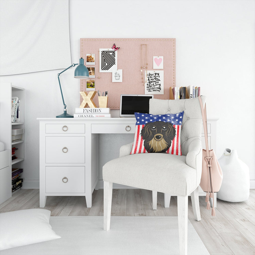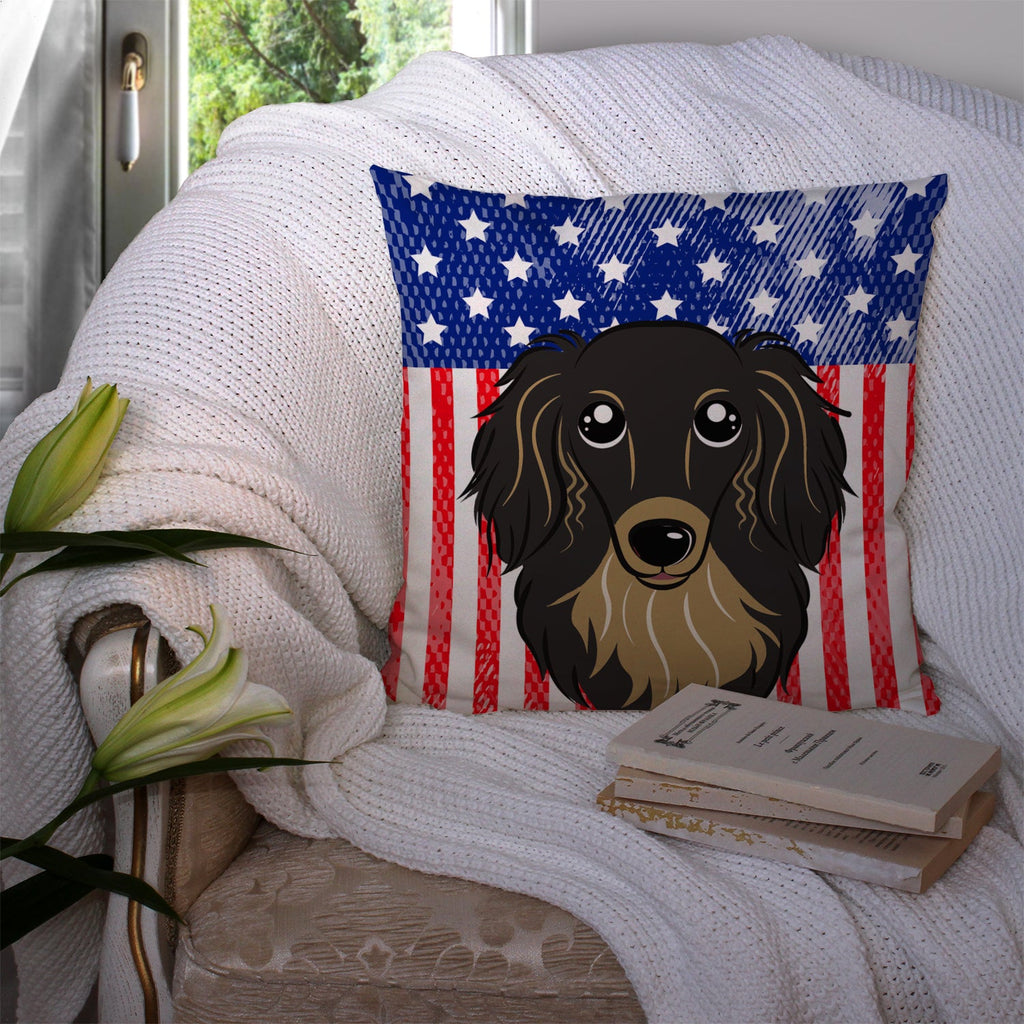 American Flag and Longhair Black and Tan Dachshund Throw Pillow - 14x14 Decorative Pillow – Art for Your Home & Patio BB2143PW1414