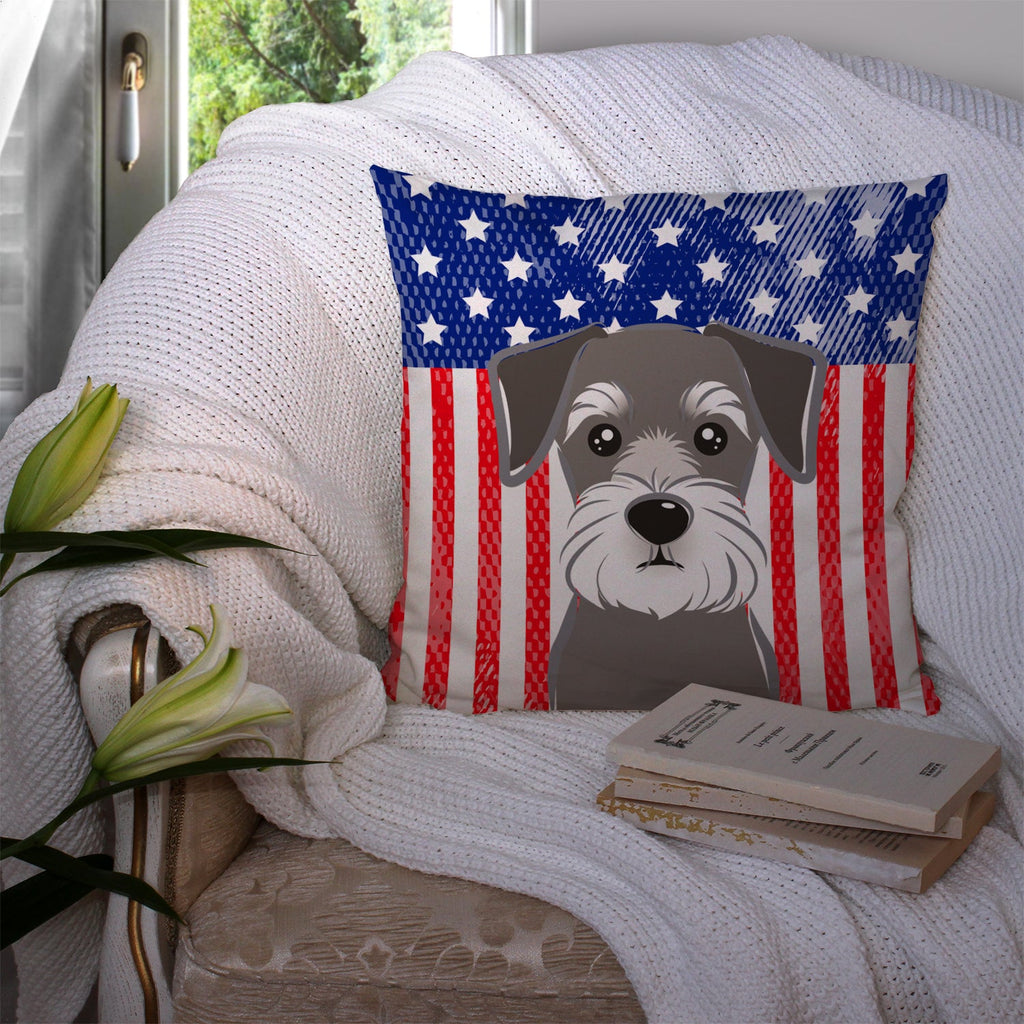 Decorate your space with our Schnauzer artwork on a Pillow. Add a touch of vibrancy and comfort to your outdoor seating with Caroline's Treasures Fabric Decorative Pillow. Measuring approximately 14 inches by 14 inches, this outdoor pillow is crafted to elevate the appeal of your patio furniture, infusing it with vivid color and artistic flair. The pillow includes a 100% Polyester Fabric sham filled with a quality pillow form to provide superior comfort. Innovatively made from our brand new material, specifically woven for its water resistance, this pillow is designed for durability. The soft canvas fabric offers versatility in use, fit for your indoor couch or your outdoor patio, porch, or veranda. The fabric is dyed with colorfast dyes built for resilience against weather conditions, ensuring the pillow retains its beauty over time. Constructed by sewing three fabric pieces to create a sham, the polyester insert is then nestled inside to form the pillow, resulting in an overstuffed pillow that maintains its shape. Both the sham and the pillow insert are proudly made in the United States. As the pillows are handcrafted, there may be minor variations in size, further enhancing their unique charm. Experience comfort in style with Caroline's Treasures Fabric Decorative Pillow.