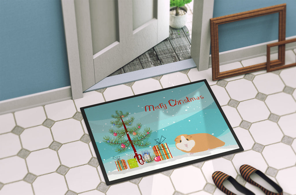 Decorate your space with our Christmas American Guinea Pig artwork on a Doormat. Welcome your guests in style with our Artwork Door Mat, designed to withstand almost any weather condition. This mat, measuring approximately 24 by 36 inches, is held together by durable black binding tape. Its top layer, composed of polyester felt, is dyed with the eye-catching image you see on the mat. A few layers below provide the mat with stability, while its rubber bottom is stamped to help prevent slipping and ensures safety. Our mat works wonderfully as both an indoor or outdoor door mat. For cleaning, simply hose it off with water or use a power washer - no need for any cleaner that produces suds. Avoid scrubbing with a brush, instead, opt for the vacuum on floor setting. Designed manufactured and printed in the USA, this mat is a perfect addition to your porch, outdoor kitchen, entryway, or any indoor space. Its unique design makes it a charming decorative rug that greets your guests and adds a stylish touch to your home decor.
