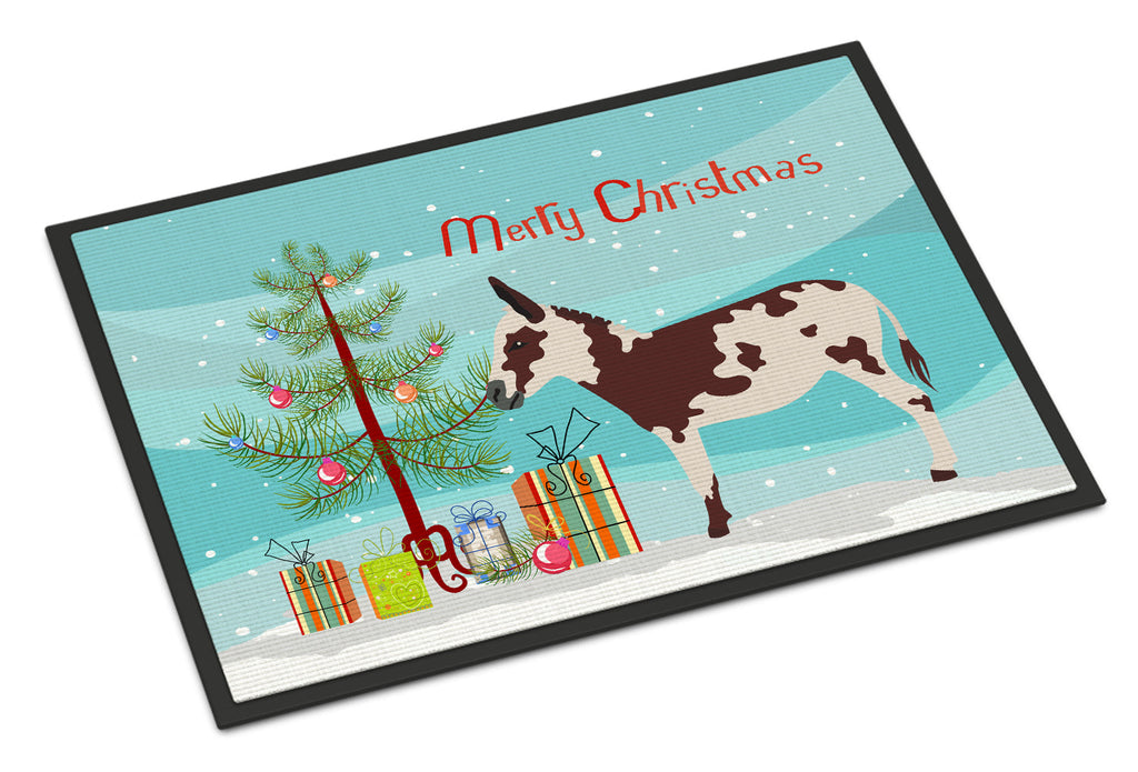 Decorate your space with our Christmas American Spotted Donkey artwork on a Doormat. Welcome your guests in style with our Artwork Door Mat, designed to withstand almost any weather condition. This mat, measuring approximately 18 by 27 inches, is held together by durable black binding tape. Its top layer, composed of polyester felt, is dyed with the eye-catching image you see on the mat. A few layers below provide the mat with stability, while its rubber bottom is stamped to help prevent slipping and ensures safety. Our mat works wonderfully as both an indoor or outdoor door mat. For cleaning, simply hose it off with water or use a power washer - no need for any cleaner that produces suds. Avoid scrubbing with a brush, instead, opt for the vacuum on floor setting. Designed manufactured and printed in the USA, this mat is a perfect addition to your porch, outdoor kitchen, entryway, or any indoor space. Its unique design makes it a charming decorative rug that greets your guests and adds a stylish touch to your home decor.