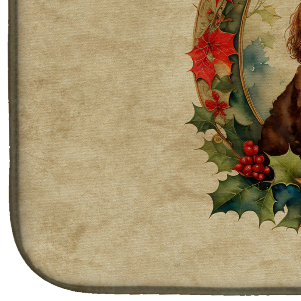 Dish Drying Mat featuring breed specific American Water Spaniel artwork. Celebrate Christmas with this Christmas Dish Drying Mat. Say goodbye to messy countertops and soggy dish towels with our innovative dish drying mat. Our high-quality dish drying pad is designed to keep your countertops dry while offering a stylish and efficient solution. Whether you're air drying dishes, glasses, stemware, silverware, pots, pans, bottles, or even fruits and vegetables, our dish mat is the perfect choice. The 14 inches x 22 inches size fits most counters and dish drying racks, and the non-slip design ensures stability. Made with water-absorbent polyester and a polyurethane foam insert, our dish drying mat is not only functional but also durable. It's machine washable and printed in the USA for long-lasting use. The beautiful artwork adds flair to your kitchen decor, making it a perfect housewarming gift or present for any occasion. Upgrade your kitchen experience with our absorbent and versatile dish drying mat.