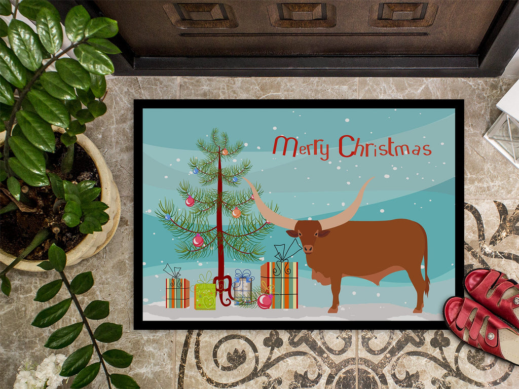 Decorate your space with our Christmas Ankole-Watusu Cow artwork on a Doormat. Welcome your guests in style with our Artwork Door Mat, designed to withstand almost any weather condition. This mat, measuring approximately 18 by 27 inches, is held together by durable black binding tape. Its top layer, composed of polyester felt, is dyed with the eye-catching image you see on the mat. A few layers below provide the mat with stability, while its rubber bottom is stamped to help prevent slipping and ensures safety. Our mat works wonderfully as both an indoor or outdoor door mat. For cleaning, simply hose it off with water or use a power washer - no need for any cleaner that produces suds. Avoid scrubbing with a brush, instead, opt for the vacuum on floor setting. Designed manufactured and printed in the USA, this mat is a perfect addition to your porch, outdoor kitchen, entryway, or any indoor space. Its unique design makes it a charming decorative rug that greets your guests and adds a stylish touch to your home decor.