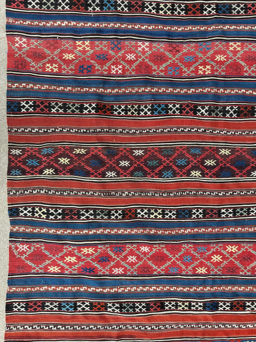 Add a little history to your life with this exquisite Antique Caucasian Shahsavan Soumak Rug from the Soviet Union. Meticulously crafted from 100% wool and hand-knotted for superior quality, this 4’9” x 7’4” rug has an 100-year-old history that is sure to add an air of sophistication to any room! Make a statement with this timeless classic.