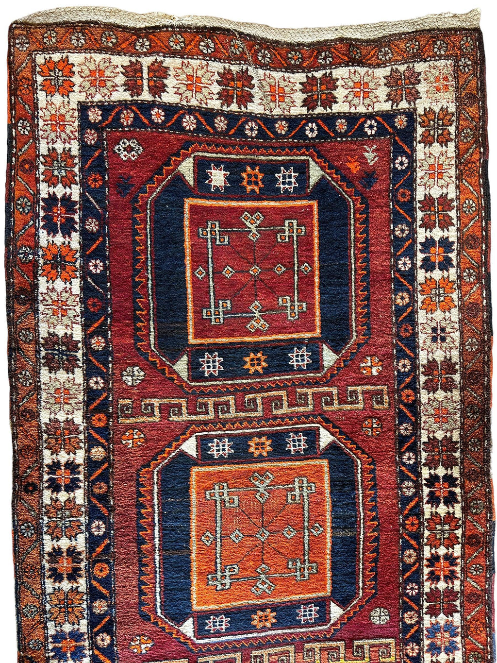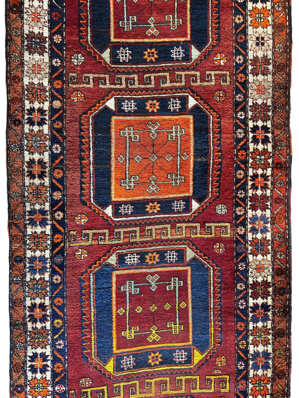 Discover a timeless piece of history with this Antique circa 1920's Kurdish-Kazak Geometric Motifs Runner. Hand-knotted from 100% wool pile, this piece offers vibrant colors and soft textures, perfect for adding a touch of artistry to any room. Rich in culture and heritage, this runner is a treasured heirloom from the Caucasus region. Bring life to your space with this pre-loved, one of a kind piece.