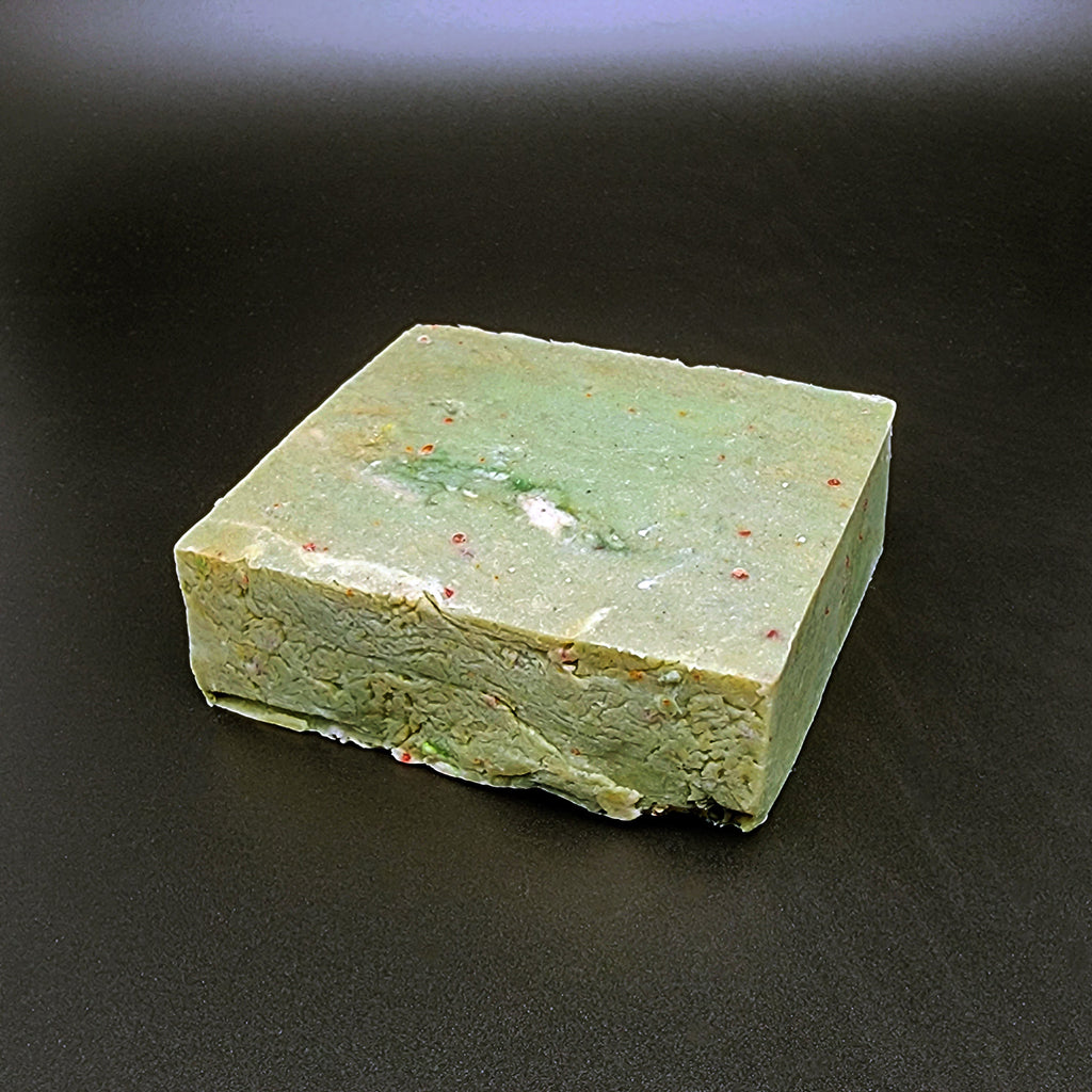 This bar soap features a festive mistletoe scent blended with angelic spice and cedarwood. Colored tapioca grains aid in exfoliation while the goat milk calms and nourishes dry winter skin. This soap is great for face or body, with a rich lather in a long-lasting, dense bar. Approximately 5 oz.