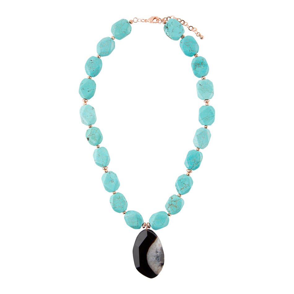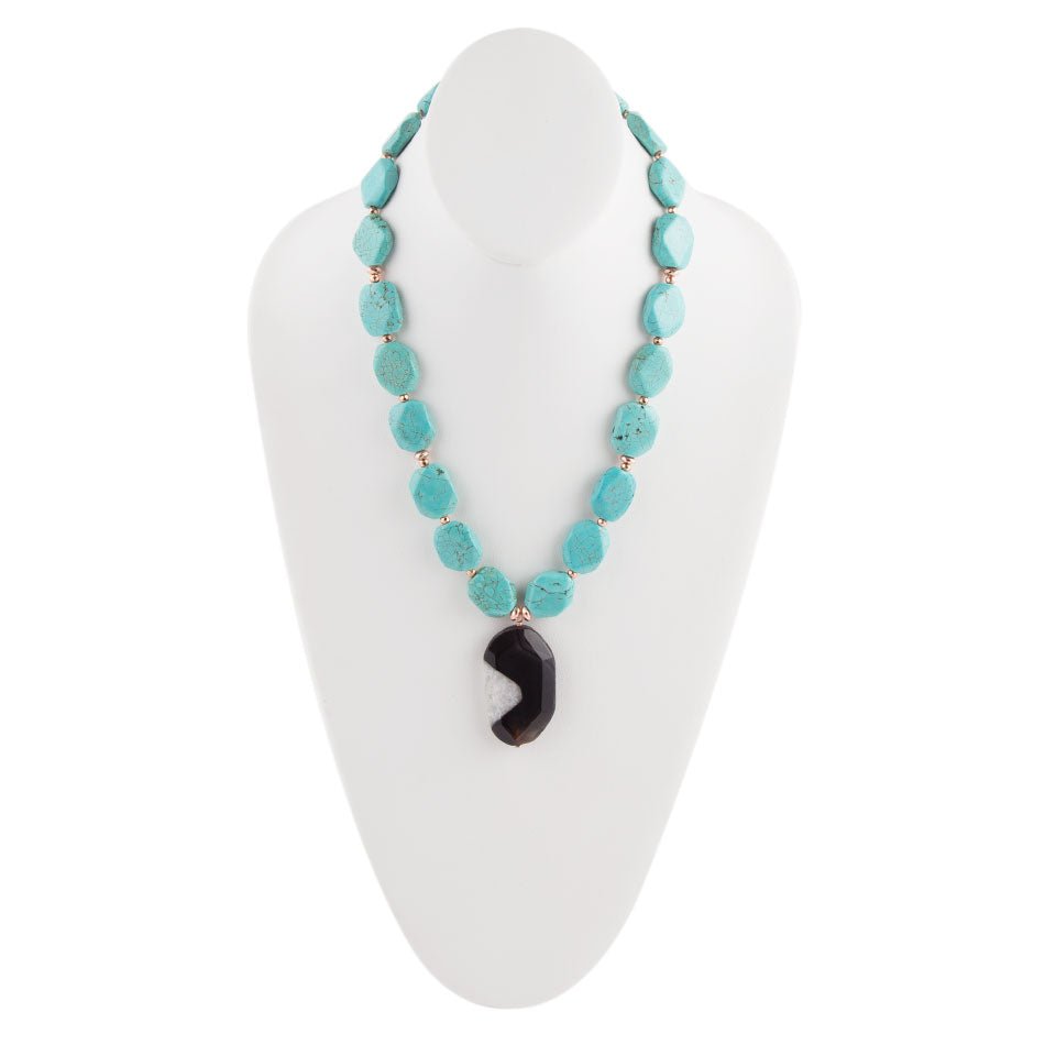 Hand-crafted and finished with genuine copper, this necklace features stunning turquoise magnesite, copper-coated hematite, and agate stones in a 1 3/4" stone slab. The pendant is 2" long and 1.25" wide, giving it a weight of 4.5 ounces. A must-have for any jewelry lover!