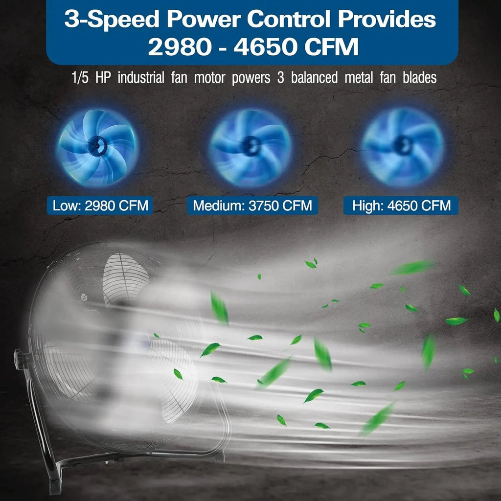 【3-Speed Control】: The 20-inch high-velocity floor fan comes with three speeds (4600 CFM/4100 CFM/3900 CFM), allowing you to customize the power to your preference. The industrial fan's grill housing features a built-in handle, making it easy to move around your workspace or garage. This heavy-duty metal floor fan offers reliable performance to keep you cool on hot summer days.