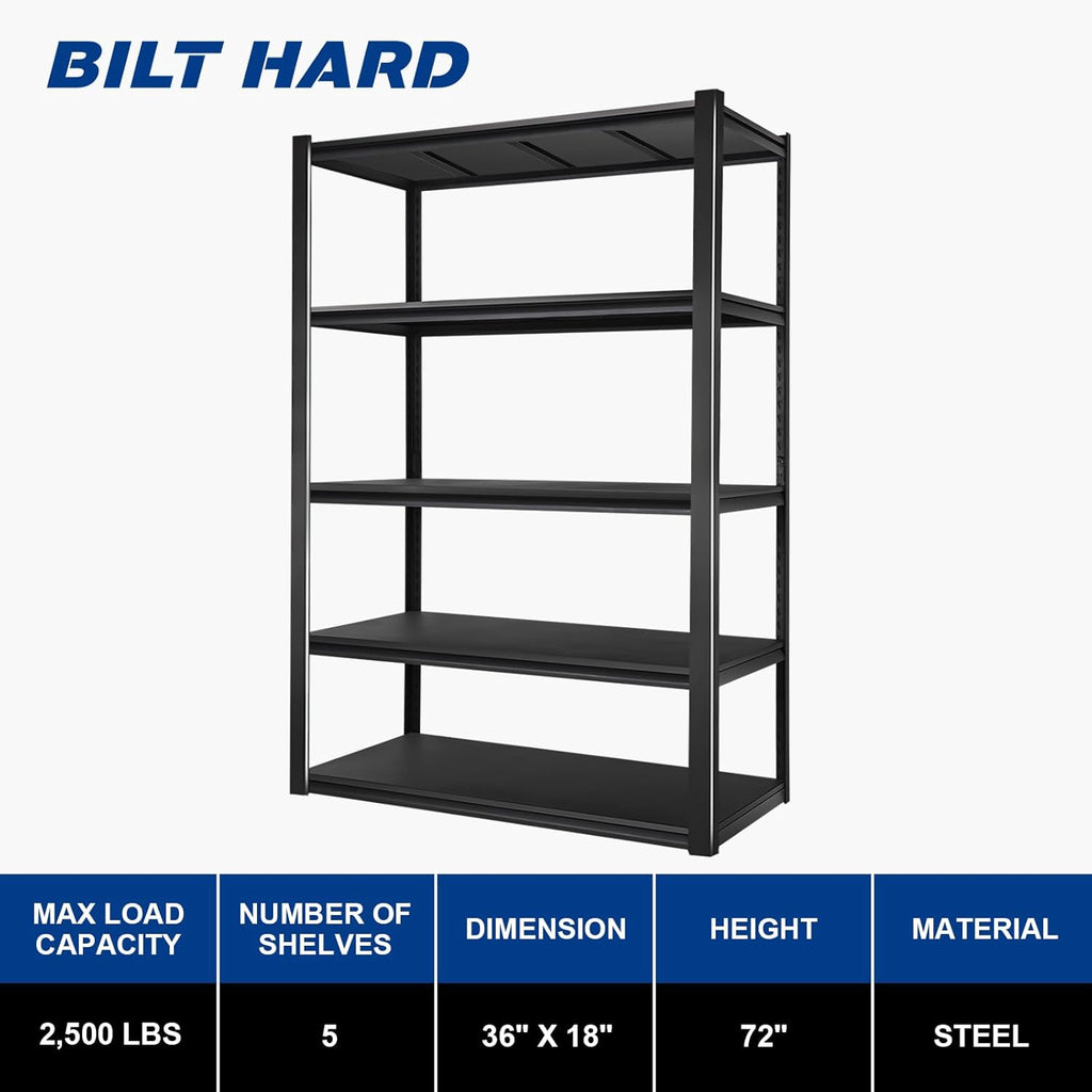 BILT HARD 2500LBS 36" W x 18" D x 72" H Garage Shelving, 5-Shelf Industrial Storage Shelves Heavy Duty, Metal Shelving Units with Adjustable Shelf, Steel Utility Shelves