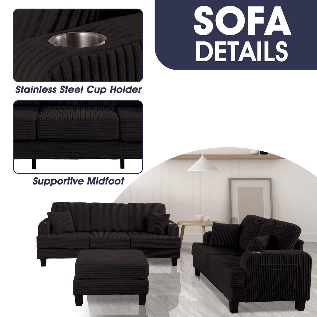 Upgrade your living space with this elegantly designed 3 piece sofa set. It includes a spacious 3-seater sofa, a cozy loveseat sofa and a practical storage ottoman. The set is crafted with comfort and convenience in mind, featuring built-in USB ports for charging your devices, and side pockets for storing remotes, magazines or other small items. It's an ideal choice for families or individuals who value both style and functionality. The set also comes with matching pillows, adding a touch of sophistication and enhancing the overall comfort. Whether you're enjoying a movie night or hosting a casual get-together, this sofa set ensures you and your guests have the best seat in the house. It's more than just a furniture set, it's a lifestyle upgrade that combines comfort, convenience and style.