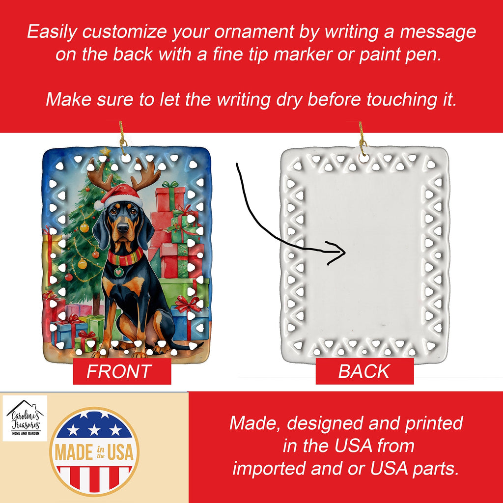 Porcelain Ornament featuring breed specific Black and Tan Coonhound artwork. Celebrate Christmas with this Christmas Ornament. Add a unique, personal touch to your holiday decor with our Rectangular Lattice Porcelain Ornament. Perfect for creating cherished memories, this high-quality ornament shines under festive lights, reflecting warmth and joy throughout your Christmas tree. Crafted with a glossy finish, it showcases vibrant, full-color artwork contributed by our talented artists, ensuring your tree is adorned with a burst of color and holiday spirit. What sets this Porcelain Ornament apart is its customizable white back. Use a paint pen or permanent marker to write a heartfelt message, commemorate a special year, or mark an unforgettable date, turning this ornament into a keepsake that will be treasured for years to come. For best results, allow any personalization to dry thoroughly before handling. Each ornament comes complete with a delicate gold cord, making it easy to hang and display. Proudly made in the USA, this ornament measures 3.375 x 2.625 inches and is a thoughtful gift for pet sitters, teachers, family members, or anyone who would appreciate a little extra holiday magic. Bring style, charm, and a touch of personal meaning to your Christmas tree with this beautifully designed ornament..