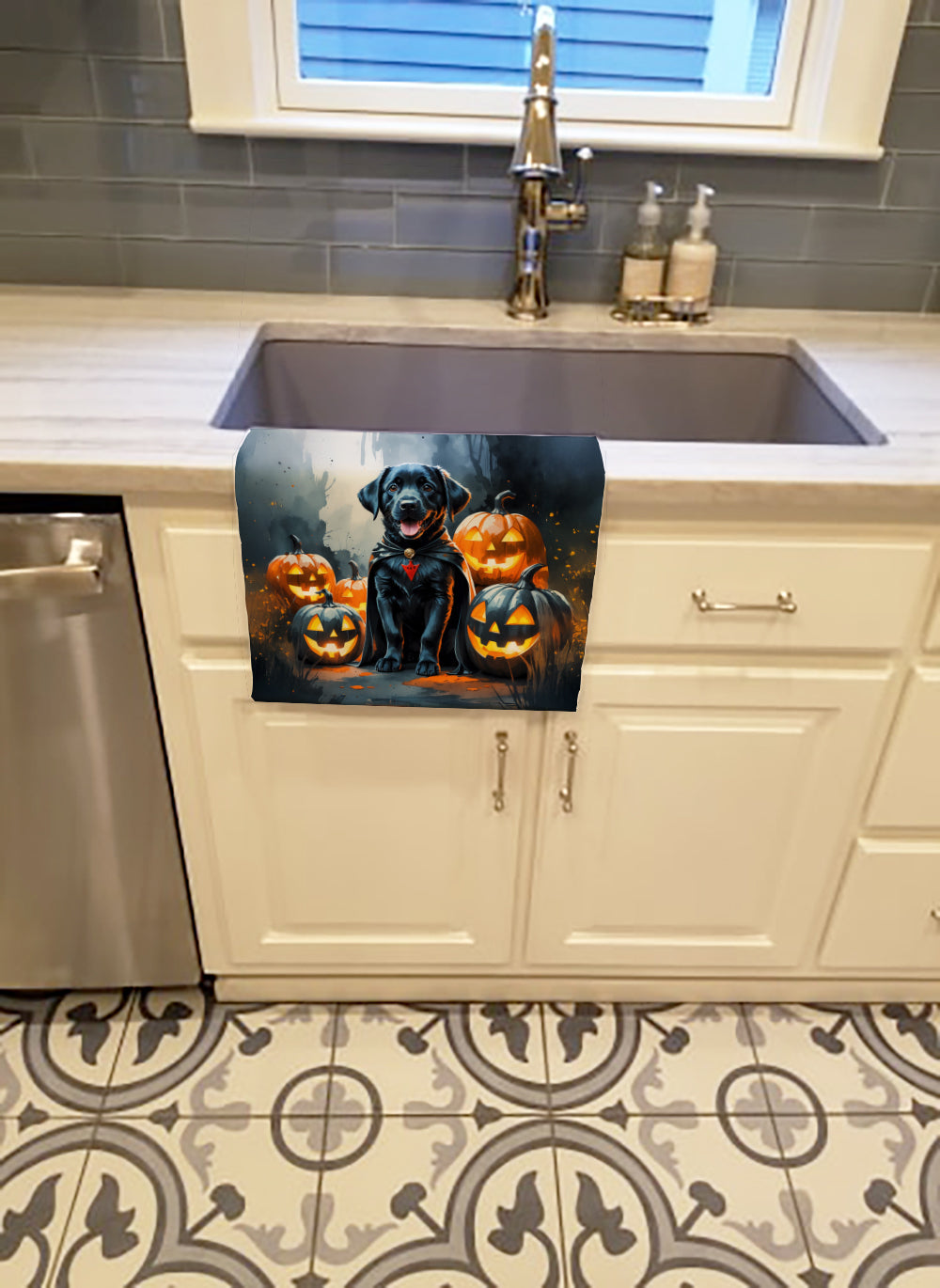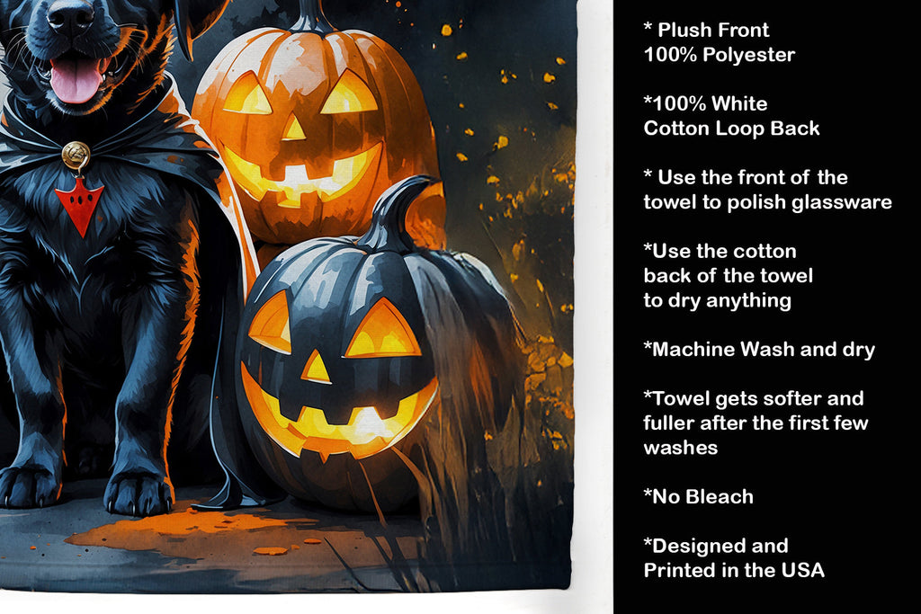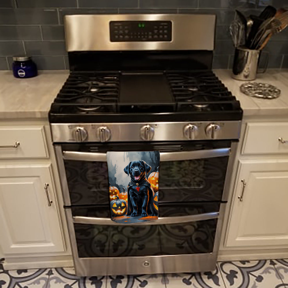 Shown here is the Black Labrador Retriever Puppy Halloween Kitchen Towel from Caroline's Treasures featuring artwork of a Labrador Retriever in a Halloween design. The detailed illustration and vibrant colors make it a standout accent that celebrates both seasonal style and love for the subject. Sink your teeth into spooky fun with our Vampire Puppy Halloween Collection. Featuring playful, canine-centric designs wrapped in Halloween style, this collection brings spirited personality and festive charm to seasonal décor and thoughtful gifts for dog lovers and Halloween fans alike. Halloween is a time for playful spooks, festive fun, and creative seasonal decorating. Fall-inspired décor helps set the mood for celebrations filled with charm, personality, and a touch of whimsy.. Bring cozy everyday charm to your sink or powder room with a plush velour towel featuring original watercolor artwork. The front is a soft, color-rich minky polyester that polishes glassware to a brilliant shine; the back is 100% white cotton terry loop for quick absorbency on hands, dishes, and counters. Artwork is dyed into the fibers for lasting color that won’t crack or peel. Finished edges keep the shape wash after wash. Size: 15" x 25". Machine wash; tumble dry low. Designed and printed in the USA. Perfect for: Kitchen counters, ovens, and towel bars, everyday drying and cleanup, Dogs-themed kitchens, or year-round use for Labrador Retriever lovers. Labrador Retrievers are strong dogs with kind expressions. Their appearance reflects loyalty and reliability. Makes a heartfelt gift for: Labrador Retriever owners, Dogs lovers, Halloween gifts, pet parents, friends who adore their Labrador Retriever, or anyone celebrating Dogs.