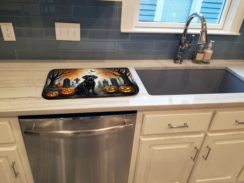 Shown here is the Black Labrador Retriever Spooky Halloween Dish Drying Mat from Caroline's Treasures featuring artwork of a Labrador Retriever in a Halloween design. The detailed illustration and vibrant colors make it a standout accent for your home. Get into the seasonal spirit with our Spooky Halloween Collection. Featuring playful and eerie designs that capture the fun and mystery of Halloween, this collection brings festive personality and spirited style to home d�cor and thoughtful seasonal gifts. Say goodbye to messy countertops and soggy dish towels with our innovative dish drying mat. Our high-quality dish drying pad is designed to keep your countertops dry while offering a stylish and efficient solution. Whether you're air drying dishes, glasses, stemware, silverware, pots, pans, bottles, or even fruits and vegetables, our dish mat is the perfect choice. The 14 inches x 22 inches size fits most counters and dish drying racks, and the non-slip design ensures stability. Made with water-absorbent polyester and a polyurethane foam insert, our dish drying mat is not only functional but also durable. It's machine washable and printed in the USA for long-lasting use. The beautiful artwork adds flair to your kitchen decor, making it a perfect housewarming gift or present for any occasion. Upgrade your kitchen experience with our absorbent and versatile dish drying mat. Labrador Retrievers are strong dogs with kind expressions. Their appearance reflects loyalty and reliability. Perfect for: Kitchen counters and sinks, everyday dish drying and countertop protection, Dogs-themed homes, or year-round use for Labrador Retriever lovers. Makes a heartfelt gift for: Labrador Retriever owners, Dogs lovers, Halloween gifts, pet parents, friends who adore their Labrador Retriever, or anyone celebrating Dogs.