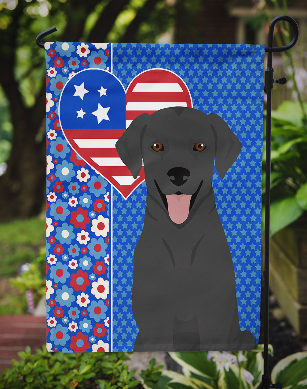 Shown here is the Black Labrador Retriever USA American Garden Flag from Caroline's Treasures featuring artwork of a Labrador Retriever in a 4th of July design. The detailed illustration and vibrant colors make it a standout accent that celebrates both seasonal style for your homet. Celebrate love for country and home with our USA Love America Collection. Featuring patriotic designs inspired by red, white, and blue traditions, this collection brings heartfelt American spirit and timeless style to home d�cor and meaningful gifts. Enhance the beauty of your garden, patio, or yard with Caroline's Treasures Decorative Garden Flag, proudly made in the USA. Crafted from two pieces of thick, double-sided polyester fabric, this 2-ply garden flag is designed to withstand various weather conditions, making it water-resistant and weatherproof. Featuring correctly readable words on both sides, this garden flag offers a delightful visual experience from any angle. With its heavier weight, it stands out among other garden flags, ensuring stability and durability even in wind, rain, and snow. Measuring approximately 11 1/4 inches by 15 1/2 inches, this flag allows you to personalize your outdoor decor. It comes with a 1 1/2-inch sleeve sewn in, allowing easy attachment to any standard garden flag stand or garden size porch hanger (sold separately). Make a statement in your outdoor space with Caroline's Treasures Decorative Garden Flag, a vibrant and high-quality flag that adds color and personality to your surroundings. Proudly made in the USA, it's a symbol of quality craftsmanship and attention to detail. Labrador Retrievers are strong dogs with kind expressions. Their appearance reflects loyalty and reliability. Perfect for: Front porches, gardens, yards, patios, 4th of July decorating, Dogs-themed homes, or year-round display for Labrador Retriever enthusiasts Makes a heartfelt gift for: Labrador Retriever owners, Dogs lovers, 4th of July gifts, pet parents, friends who adore their Labrador Retriever, or anyone celebrating Dogs.