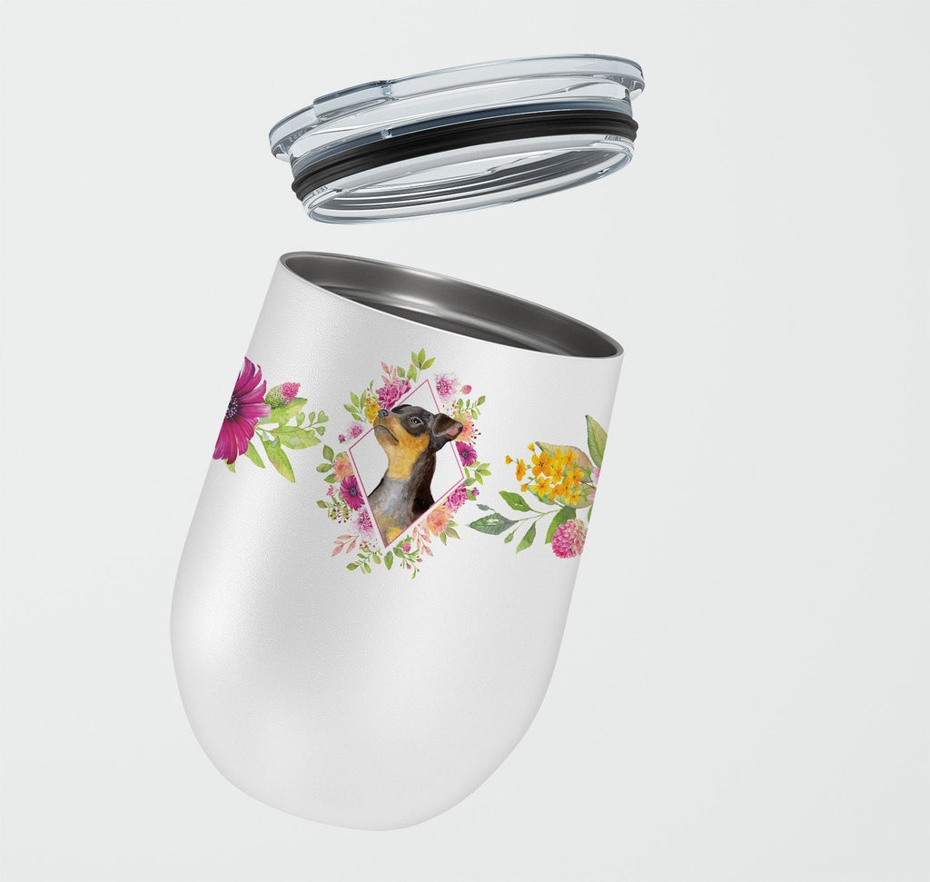 Shown here is the Black Miniature Pinscher Pink Flowers Stainless Steel 12 oz Stemless Wine Glass from Caroline's Treasures featuring artwork of a Miniature Pinscher in a Everyday design. The detailed illustration and vibrant colors make it a standout accent for your home. Enjoy your favorite beverage in style and comfort with our beautifully crafted 12-ounce Double Wall Vacuum Insulated Stainless Steel Stemless Wine Glass. This stylish tumbler, with its sleek and modern design, caters to both men and women who appreciate quality and elegance in their drinkware. This stemless wine glass boasts a double-walled vacuum insulated design to keep your wine at the perfect temperature for longer, providing you with an exceptional drinking experience. The tumbler's stainless steel construction ensures durability, while its easy-to-grasp shape offers a comfortable hold for prolonged enjoyment. With safety and health as our top priority, our wine glass is 100% free from BPA and Phthalates. It features a secure lid with an easy opening for hassle-free sipping. The vibrant color artwork adds a personalized touch, enhancing your overall drinking experience. Although sturdy, we recommend hand washing this product to maintain its unique qualities. Embrace sustainability by replacing disposable plastic bottles with our reusable Tumblers. A simple choice that can significantly reduce environmental pollution. Perfectly packed in a gift box, our tumbler is an excellent gift choice for your loved ones. Elevate your wine-drinking experience and make a positive impact on the environment with our remarkable tumbler._x000B_ Miniature Pinschers, often called Min Pins, are energetic companion dogs known for their confidence and alert personality. This spirited breed is valued for its intelligence and fearless attitude. Makes a heartfelt gift for: Miniature Pinscher owners, Dogs lovers, Everyday gifts, pet parents, friends who adore their Miniature Pinscher, or anyone celebrating Dogs.