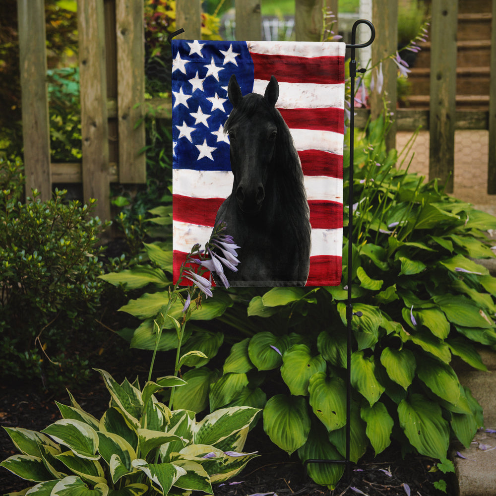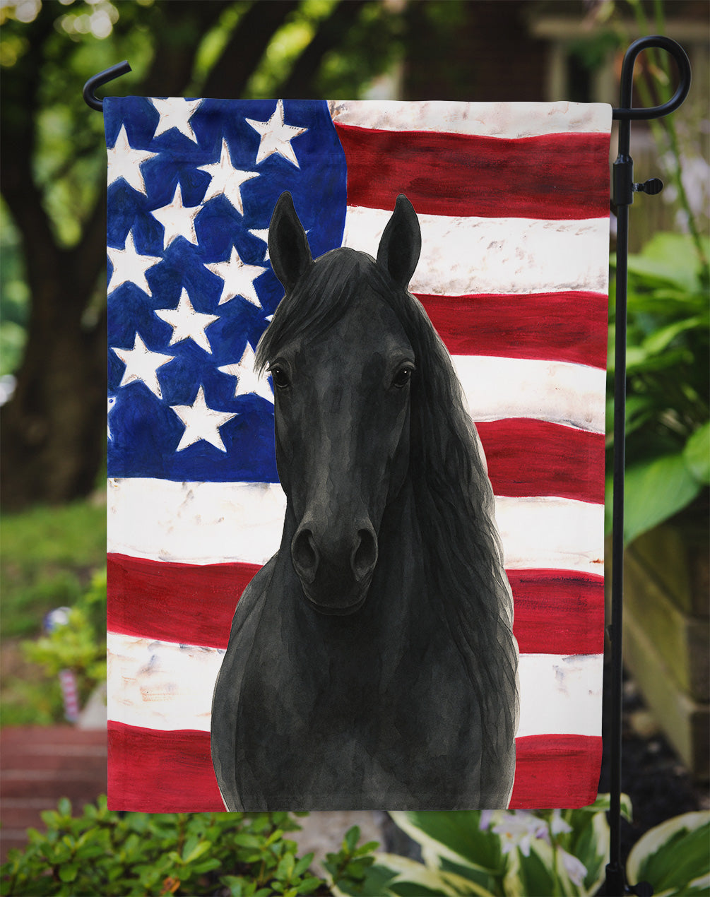 Shown here is the Black Morgan Horse American Garden Flag from Caroline's Treasures featuring artwork of a Morgan in a design. The detailed illustration and vibrant colors make it a standout accent that celebrates both seasonal style and love for the subject. Patriotic celebrations honor national pride, tradition, and the spirit of togetherness. Red, white, and blue décor adds a classic, meaningful touch to homes during summer holidays and beyond. Enhance the beauty of your garden, patio, or yard with Caroline's Treasures Decorative Garden Flag, proudly made in the USA. Crafted from two pieces of thick, double-sided polyester fabric, this 2-ply garden flag is designed to withstand various weather conditions, making it water-resistant and weatherproof. Featuring correctly readable words on both sides, this garden flag offers a delightful visual experience from any angle. With its heavier weight, it stands out among other garden flags, ensuring stability and durability even in wind, rain, and snow. Measuring approximately 11 1/4 inches by 15 1/2 inches, this flag allows you to personalize your outdoor decor. It comes with a 1 1/2-inch sleeve sewn in, allowing easy attachment to any standard garden flag stand or garden size porch hanger (sold separately). Make a statement in your outdoor space with Caroline's Treasures Decorative Garden Flag, a vibrant and high-quality flag that adds color and personality to your surroundings. Proudly made in the USA, it's a symbol of quality craftsmanship and attention to detail. Perfect for: Front porches, gardens, yards, patios, 4th of July decorating, Farm Animals-themed homes, or year-round display for Morgan enthusiasts Morgan horses feature compact muscular builds and refined heads. Their appearance reflects strength and versatility. Makes a heartfelt gift for: Morgan owners, Farm Animals lovers, 4th of July gifts, pet parents, friends who adore their Morgan, or anyone celebrating Farm Animals.