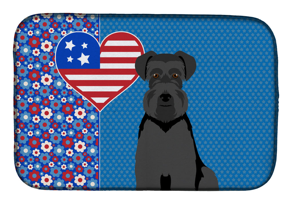 Shown here is the Black Natural Ears Schnauzer USA American Dish Drying Mat from Caroline's Treasures featuring artwork of a Schnauzer in a 4th of July design. The detailed illustration and vibrant colors make it a standout accent that celebrates both seasonal style for your homet. Celebrate love for country and home with our USA Love America Collection. Featuring patriotic designs inspired by red, white, and blue traditions, this collection brings heartfelt American spirit and timeless style to home d�cor and meaningful gifts. Say goodbye to messy countertops and soggy dish towels with our innovative dish drying mat. Our high-quality dish drying pad is designed to keep your countertops dry while offering a stylish and efficient solution. Whether you're air drying dishes, glasses, stemware, silverware, pots, pans, bottles, or even fruits and vegetables, our dish mat is the perfect choice. The 14 inches x 22 inches size fits most counters and dish drying racks, and the non-slip design ensures stability. Made with water-absorbent polyester and a polyurethane foam insert, our dish drying mat is not only functional but also durable. It's machine washable and printed in the USA for long-lasting use. The beautiful artwork adds flair to your kitchen decor, making it a perfect housewarming gift or present for any occasion. Upgrade your kitchen experience with our absorbent and versatile dish drying mat. Schnauzers are intelligent dogs known for their distinctive bearded appearance and alert nature. Available in miniature, standard, and giant sizes, this breed is valued for its loyalty and versatility. Perfect for: Kitchen counters and sinks, everyday dish drying and countertop protection, Dogs-themed homes, or year-round use for Schnauzer lovers. Makes a heartfelt gift for: Schnauzer owners, Dogs lovers, 4th of July gifts, pet parents, friends who adore their Schnauzer, or anyone celebrating Dogs.