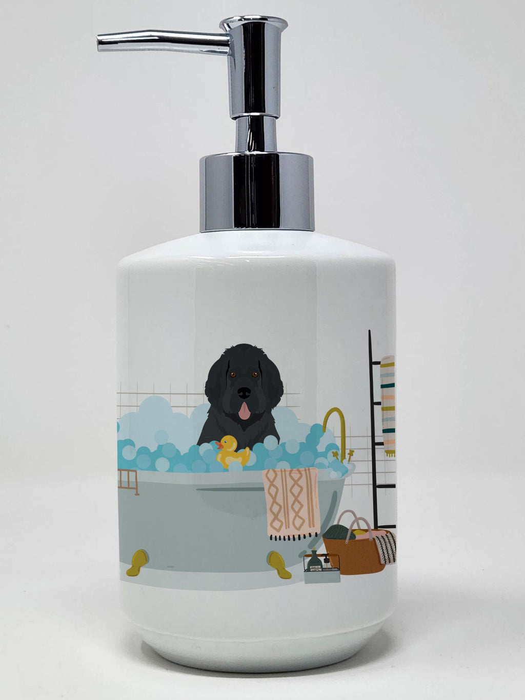 Shown here is the Black Newfoundland Ceramic Soap Dispenser from Caroline's Treasures featuring artwork of a Newfoundland in a Everyday design. The detailed illustration and vibrant colors make it a standout accent for your home. Revitalize your kitchen or bathroom decor with the Decorative Ceramic Soap Dispenser from Caroline's Treasures. This refillable dispenser marries practicality and style, serving as a vibrant art piece in addition to its primary function. The dispenser's exterior boasts colorful artwork from one of Caroline's Treasures' artists, wrapping around the dispenser to add a touch of personality and color to your space. Measuring approximately 7 1/4 inches high and about 3 1/2 inches in diameter, it is the perfect size for any countertop. The dispenser features a sturdy pump nozzle, which screws easily into the top of the ceramic dispenser. With a simple press, you can conveniently dispense your preferred liquid soap, lotion, aromatherapy essential oil blend, shampoo, body wash, or even massage oils. The Decorative Ceramic Soap Dispenser is more than a functional item - it's a statement piece that adds a unique touch to your bathroom or kitchen decor, transforming everyday rituals into an artful experience. Newfoundlands are gentle working dogs known for their strength and sweet temperament. Often called Newfies, this breed is cherished for its loyalty, patience, and calm confidence. Makes a heartfelt gift for: Newfoundland owners, Dogs lovers, Everyday gifts, pet parents, friends who adore their Newfoundland, or anyone celebrating Dogs.