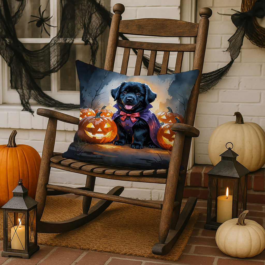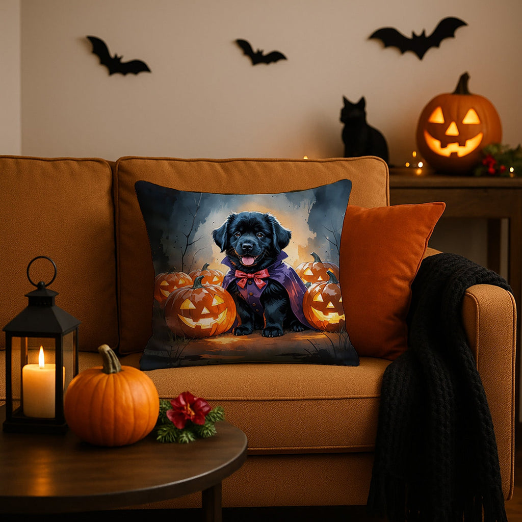 Shown here is the Black Newfoundland Puppy Halloween Throw Pillow from Caroline's Treasures featuring artwork of a Newfoundland in a Halloween design. The detailed illustration and vibrant colors make it a standout accent that celebrates both seasonal style and love for the subject. Sink your teeth into spooky fun with our Vampire Puppy Halloween Collection. Featuring playful, canine-centric designs wrapped in Halloween style, this collection brings spirited personality and festive charm to seasonal décor and thoughtful gifts for dog lovers and Halloween fans alike. Halloween is a time for playful spooks, festive fun, and creative seasonal decorating. Fall-inspired décor helps set the mood for celebrations filled with charm, personality, and a touch of whimsy.. Revitalize your outdoor or indoor living space with Caroline's Treasures 18x18 Fabric Decorative Pillow. With a generously sized dimension of approximately 18 inches by 18 inches, this pillow makes a comfortable and aesthetic addition to any seating area. Made from a unique, water-resistant material developed by Caroline's Treasures, the pillow sham is 100% polyester fabric that's durable and ready to weather any condition. Its vibrant, full-color artwork will not fade over time as it is dyed with color-fast dyes. Whether you place it on your patio furniture, porch, veranda, or indoor couch, its soft canvas fabric ensures a cozy experience. The pillow is handcrafted in the United States, featuring a sham created from three pieces of fabric and a polyester insert for enduring shape and overstuffed comfort. Despite being robustly built to endure the outdoors, it is as soft and snug as your favorite indoor cushions. Please note, as all our pillows are handmade, sizes may vary slightly, adding to the charm of this unique decorative item. Perfect for: Living rooms, bedrooms, couches, and chairs, seasonal or everyday decorating, Dogs-themed homes, or year-round display for Newfoundland fans. Newfoundlands are gentle working dogs known for their strength and sweet temperament. Often called Newfies, this breed is cherished for its loyalty, patience, and calm confidence. Makes a heartfelt gift for: Newfoundland owners, Dogs lovers, Halloween gifts, pet parents, friends who adore their Newfoundland, or anyone celebrating Dogs.