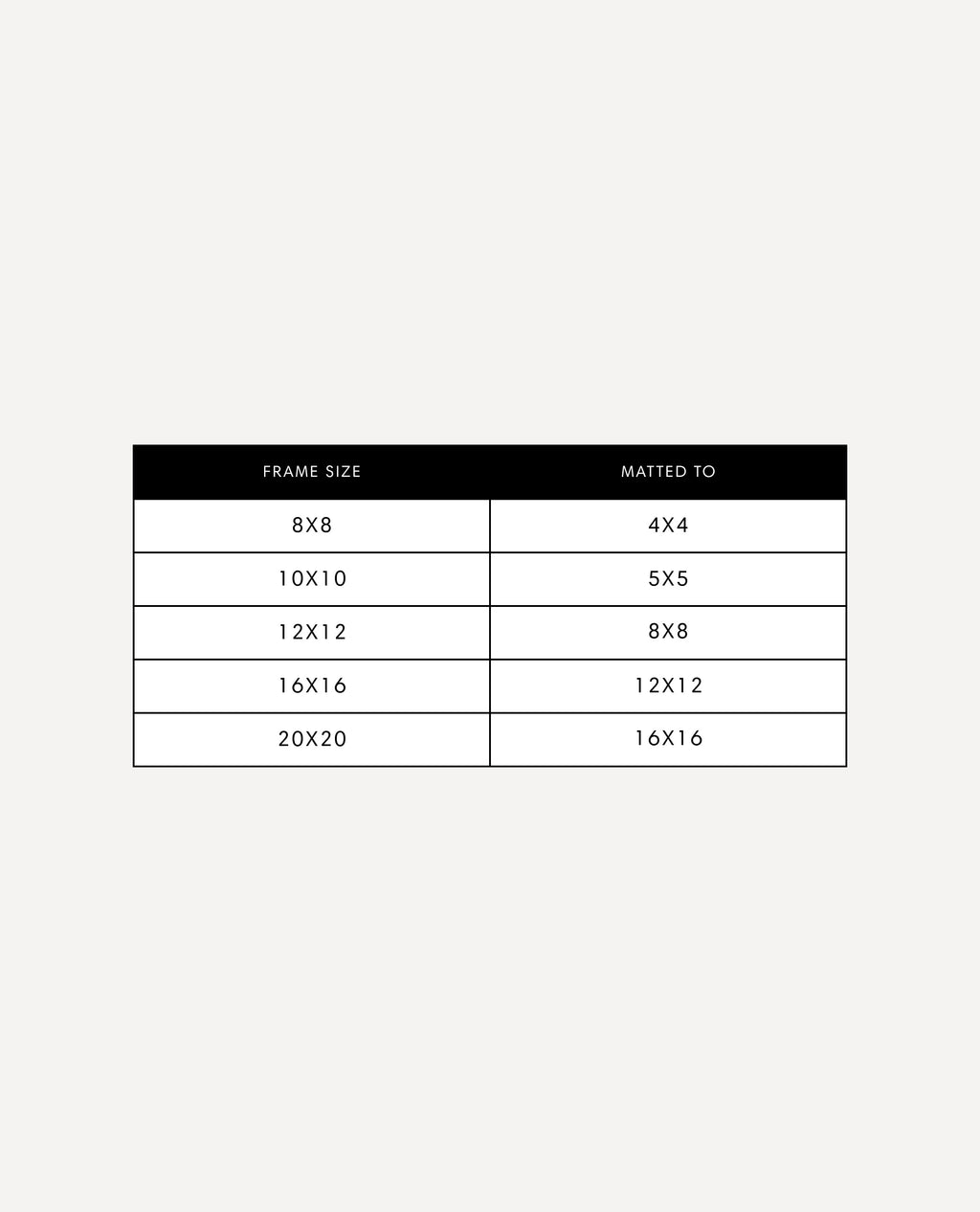 - Our 20x20 frame is matted to 16x16.