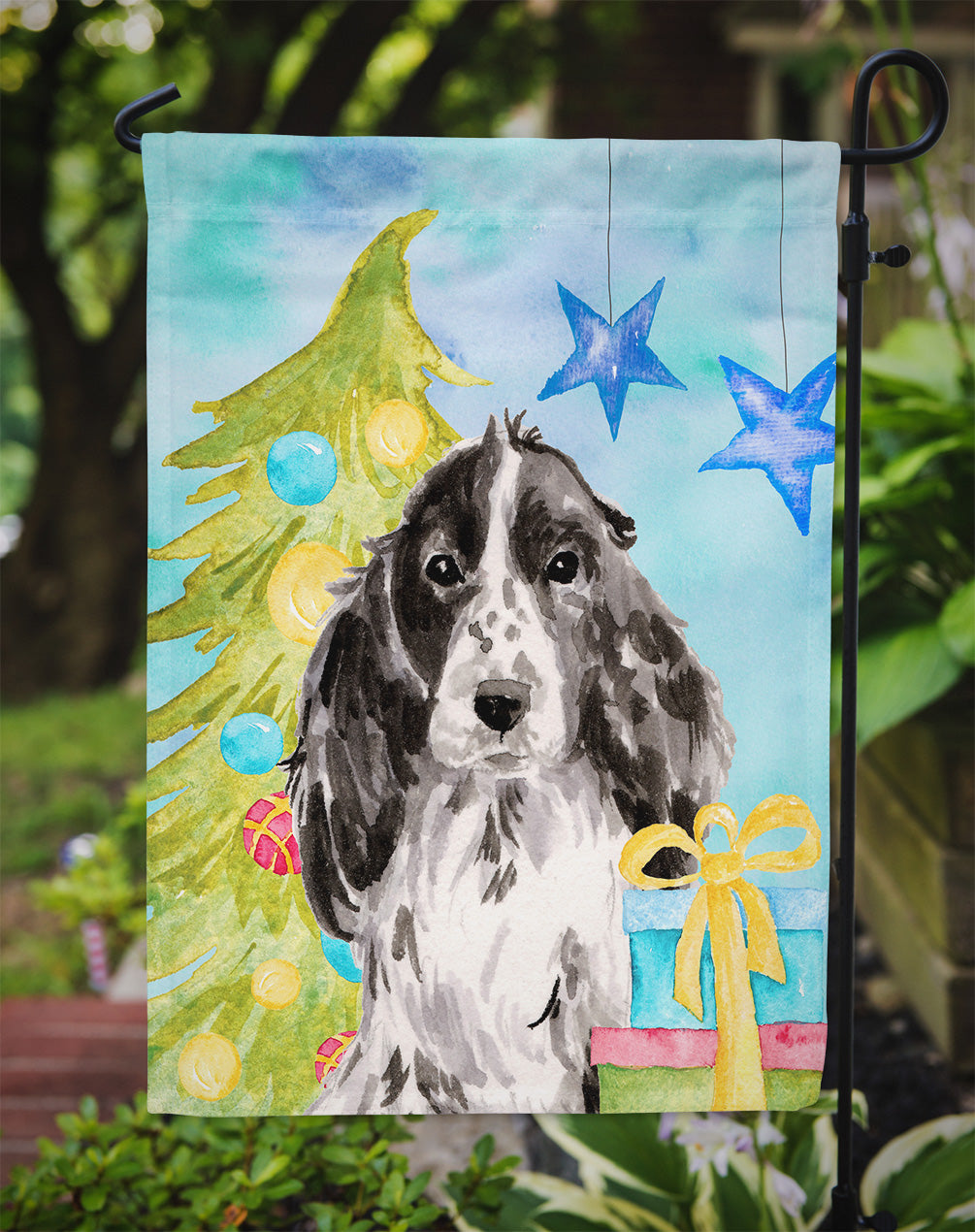 Decorate your space with our Christmas Cocker Spaniel artwork on a Garden Flag. Enhance the beauty of your garden, patio, or yard with Caroline's Treasures Decorative Garden Flag, proudly made in the USA. Crafted from two pieces of thick, double-sided polyester fabric, this 2-ply garden flag is designed to withstand various weather conditions, making it water-resistant and weatherproof. Featuring correctly readable words on both sides, this garden flag offers a delightful visual experience from any angle. With its heavier weight, it stands out among other garden flags, ensuring stability and durability even in wind, rain, and snow. Measuring approximately 11 1/4 inches by 15 1/2 inches, this flag allows you to personalize your outdoor decor. It comes with a 1 1/2-inch sleeve sewn in, allowing easy attachment to any standard garden flag stand or garden size porch hanger (sold separately). Make a statement in your outdoor space with Caroline's Treasures Decorative Garden Flag, a vibrant and high-quality flag that adds color and personality to your surroundings. Proudly made in the USA, it's a symbol of quality craftsmanship and attention to detail.