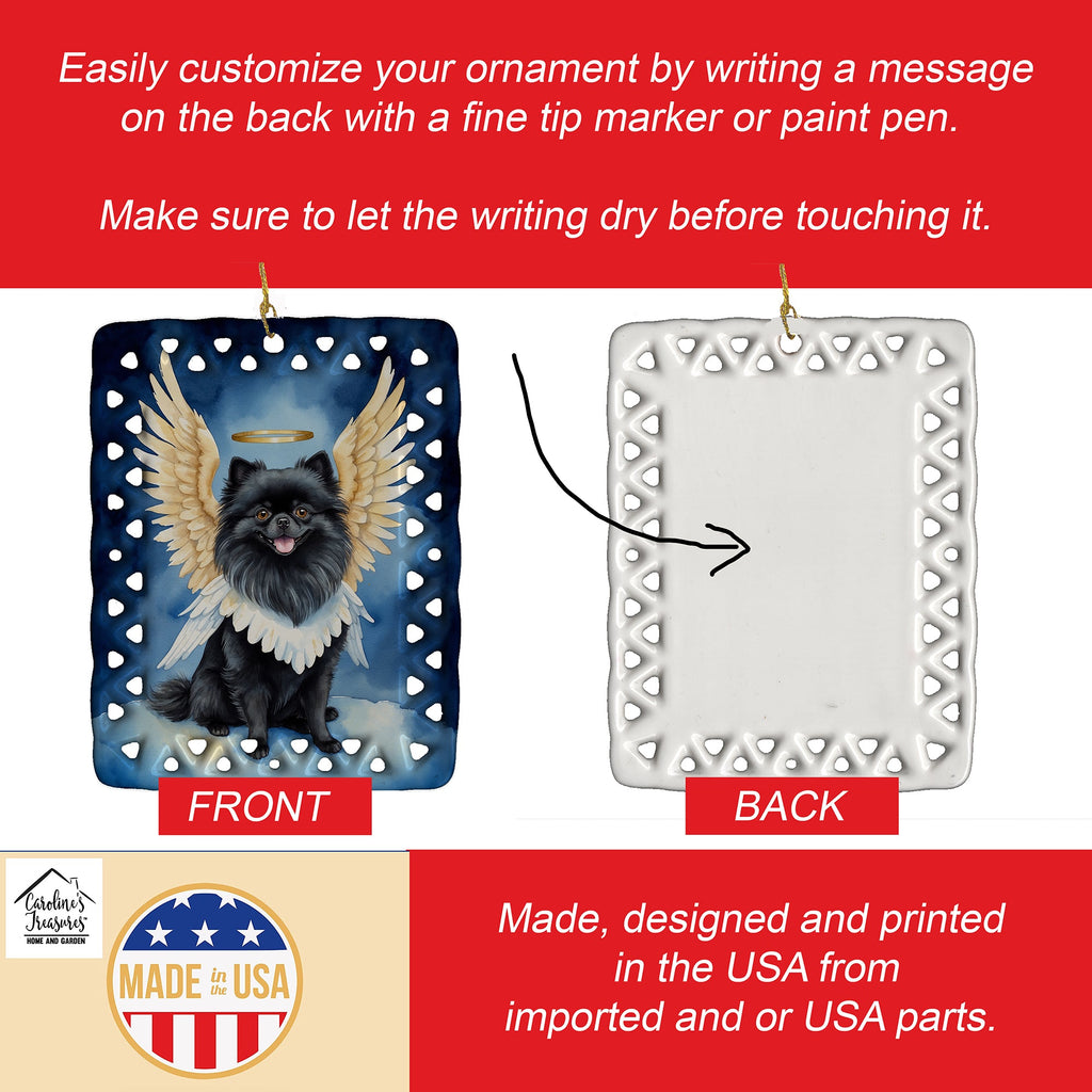 Shown here is the Black Pomeranian My Angel Porcelain Ornament from Caroline's Treasures featuring artwork of a Pomeranian in a Christmas design. The detailed illustration and vibrant colors make it a standout accent for your home. Honor cherished memories with our My Angel Collection. Featuring heartfelt designs that celebrate love, remembrance, and special bonds, this collection brings comfort and meaningful style to home décor and thoughtful gifts. Add a unique, personal touch to your holiday decor with our Rectangular Lattice Porcelain Ornament. Perfect for creating cherished memories, this high-quality ornament shines under festive lights, reflecting warmth and joy throughout your Christmas tree. Crafted with a glossy finish, it showcases vibrant, full-color artwork contributed by our talented artists, ensuring your tree is adorned with a burst of color and holiday spirit. What sets this Porcelain Ornament apart is its customizable white back. Use a paint pen or permanent marker to write a heartfelt message, commemorate a special year, or mark an unforgettable date, turning this ornament into a keepsake that will be treasured for years to come. For best results, allow any personalization to dry thoroughly before handling. Each ornament comes complete with a delicate gold cord, making it easy to hang and display. Proudly made in the USA, this ornament measures 3.375 x 2.625 inches and is a thoughtful gift for pet sitters, teachers, family members, or anyone who would appreciate a little extra holiday magic. Bring style, charm, and a touch of personal meaning to your Christmas tree with this beautifully designed ornament.. Pomeranians are small companion dogs known for their fluffy coats and lively personality. This breed is cherished for its confidence, intelligence, and affectionate nature. Perfect for: Christmas trees, wreaths, garlands, and holiday displays, festive seasonal decorating, Dogs-themed holiday homes, or year-after-year use for Pomeranian enthusiasts. Makes a heartfelt gift for: Pomeranian owners, Dogs lovers, Christmas gifts, pet parents, friends who adore their Pomeranian, or anyone celebrating Dogs.