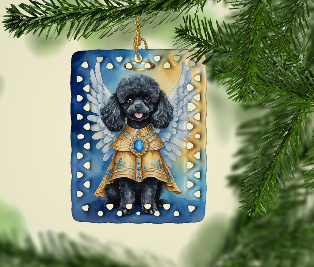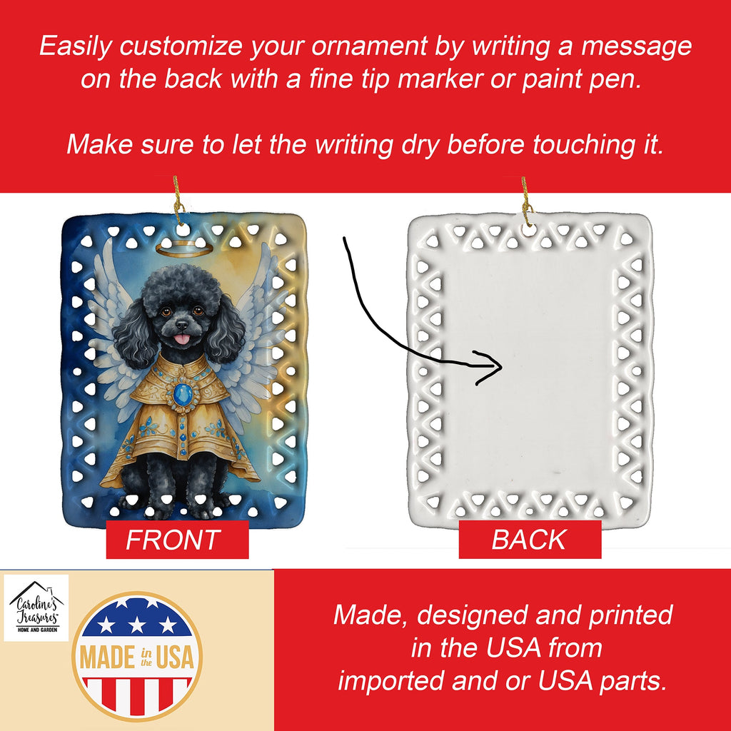 Shown here is the Black Poodle My Angel Porcelain Ornament from Caroline's Treasures featuring artwork of a Poodle in a Christmas design. The detailed illustration and vibrant colors make it a standout accent for your home. Honor cherished memories with our My Angel Collection. Featuring heartfelt designs that celebrate love, remembrance, and special bonds, this collection brings comfort and meaningful style to home décor and thoughtful gifts. Add a unique, personal touch to your holiday decor with our Rectangular Lattice Porcelain Ornament. Perfect for creating cherished memories, this high-quality ornament shines under festive lights, reflecting warmth and joy throughout your Christmas tree. Crafted with a glossy finish, it showcases vibrant, full-color artwork contributed by our talented artists, ensuring your tree is adorned with a burst of color and holiday spirit. What sets this Porcelain Ornament apart is its customizable white back. Use a paint pen or permanent marker to write a heartfelt message, commemorate a special year, or mark an unforgettable date, turning this ornament into a keepsake that will be treasured for years to come. For best results, allow any personalization to dry thoroughly before handling. Each ornament comes complete with a delicate gold cord, making it easy to hang and display. Proudly made in the USA, this ornament measures 3.375 x 2.625 inches and is a thoughtful gift for pet sitters, teachers, family members, or anyone who would appreciate a little extra holiday magic. Bring style, charm, and a touch of personal meaning to your Christmas tree with this beautifully designed ornament.. Poodles are highly intelligent dogs known for their elegance and versatility. Available in standard, miniature, and toy sizes, this breed is admired for its trainability and loyalty. Perfect for: Christmas trees, wreaths, garlands, and holiday displays, festive seasonal decorating, Dogs-themed holiday homes, or year-after-year use for Poodle enthusiasts. Makes a heartfelt gift for: Poodle owners, Dogs lovers, Christmas gifts, pet parents, friends who adore their Poodle, or anyone celebrating Dogs.
