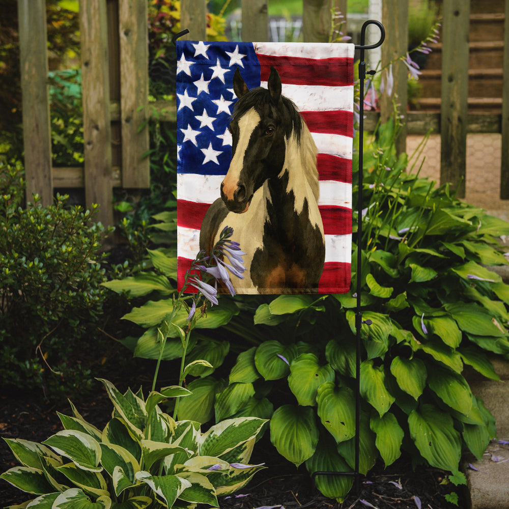 Shown here is the Black Tobiano Paint Horse American Garden Flag from Caroline's Treasures featuring artwork of a Paint Horse in a design. The detailed illustration and vibrant colors make it a standout accent that celebrates both seasonal style and love for the subject. Patriotic celebrations honor national pride, tradition, and the spirit of togetherness. Red, white, and blue décor adds a classic, meaningful touch to homes during summer holidays and beyond. Enhance the beauty of your garden, patio, or yard with Caroline's Treasures Decorative Garden Flag, proudly made in the USA. Crafted from two pieces of thick, double-sided polyester fabric, this 2-ply garden flag is designed to withstand various weather conditions, making it water-resistant and weatherproof. Featuring correctly readable words on both sides, this garden flag offers a delightful visual experience from any angle. With its heavier weight, it stands out among other garden flags, ensuring stability and durability even in wind, rain, and snow. Measuring approximately 11 1/4 inches by 15 1/2 inches, this flag allows you to personalize your outdoor decor. It comes with a 1 1/2-inch sleeve sewn in, allowing easy attachment to any standard garden flag stand or garden size porch hanger (sold separately). Make a statement in your outdoor space with Caroline's Treasures Decorative Garden Flag, a vibrant and high-quality flag that adds color and personality to your surroundings. Proudly made in the USA, it's a symbol of quality craftsmanship and attention to detail. Perfect for: Front porches, gardens, yards, patios, 4th of July decorating, Farm Animals-themed homes, or year-round display for Paint Horse enthusiasts Paint horses are known for bold coat patterns and muscular builds. Their striking coloration adds visual impact. Makes a heartfelt gift for: Paint Horse owners, Farm Animals lovers, 4th of July gifts, pet parents, friends who adore their Paint Horse, or anyone celebrating Farm Animals.
