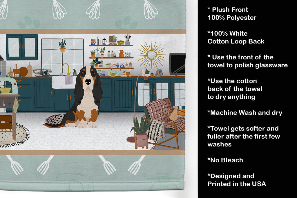 Shown here is the Black Tricolor Basset Hound in the Kitchen Kitchen Towel from Caroline's Treasures featuring artwork of a Basset Hound in a Everyday design. The detailed illustration and vibrant colors make it a standout accent for your home. Bring cozy everyday charm to your sink or powder room with a plush velour towel featuring original watercolor artwork. The front is a soft, color-rich minky polyester that polishes glassware to a brilliant shine; the back is 100% white cotton terry loop for quick absorbency on hands, dishes, and counters. Artwork is dyed into the fibers for lasting color that won�t crack or peel. Finished edges keep the shape wash after wash. Size: 15" x 25". Machine wash; tumble dry low. Designed and printed in the USA. Basset Hounds are scent hounds known for their long ears, calm demeanor, and exceptional sense of smell. This laid-back breed is loved for its gentle personality and loyal companionship. Perfect for: Kitchen counters, ovens, and towel bars, everyday drying and cleanup, Dogs-themed kitchens, or year-round use for Basset Hound lovers. Makes a heartfelt gift for: Basset Hound owners, Dogs lovers, Everyday gifts, pet parents, friends who adore their Basset Hound, or anyone celebrating Dogs.