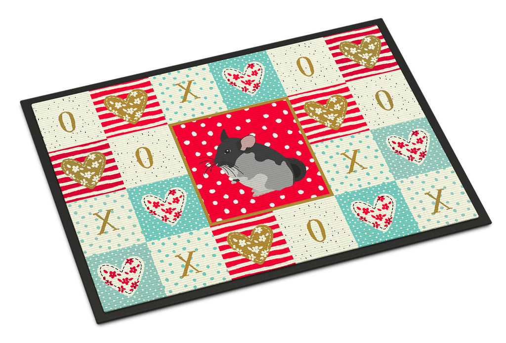 Shown here is the Black Velvet Chinchilla Love Doormat from Caroline's Treasures featuring artwork of a Black Velvet Chinchilla in a Valentine's Day design. The detailed illustration and vibrant colors make it a standout accent for your home. Welcome your guests in style with our Artwork Door Mat, designed to withstand almost any weather condition. This mat, measuring approximately 18 by 27 inches, is held together by durable black binding tape. Its top layer, composed of polyester felt, is dyed with the eye-catching image you see on the mat. A few layers below provide the mat with stability, while its rubber bottom is stamped to help prevent slipping and ensures safety. Our mat works wonderfully as both an indoor or outdoor door mat. For cleaning, simply hose it off with water or use a power washer - no need for any cleaner that produces suds. Avoid scrubbing with a brush, instead, opt for the vacuum on floor setting. Designed manufactured and printed in the USA, this mat is a perfect addition to your porch, outdoor kitchen, entryway, or any indoor space. Its unique design makes it a charming decorative rug that greets your guests and adds a stylish touch to your home decor. Perfect for: Front doors, entryways, and porches, everyday home d�cor, Rodents-themed homes, or year-round display for Black Velvet Chinchilla lovers. Makes a heartfelt gift for: Black Velvet Chinchilla owners, Rodents lovers, Valentine's Day gifts, pet parents, friends who adore their Black Velvet Chinchilla, or anyone celebrating Rodents.