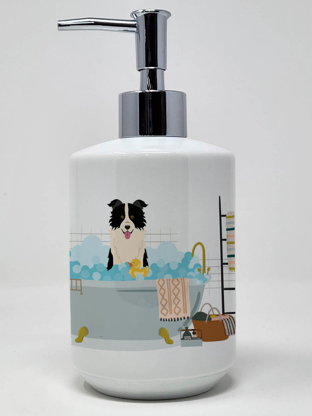Shown here is the Black White Border Collie in Bathtub Ceramic Soap Dispenser from Caroline's Treasures featuring artwork of a Border Collie in a Everyday design. The detailed illustration and vibrant colors make it a standout accent for your home. Revitalize your kitchen or bathroom decor with the Decorative Ceramic Soap Dispenser from Caroline's Treasures. This refillable dispenser marries practicality and style, serving as a vibrant art piece in addition to its primary function. The dispenser's exterior boasts colorful artwork from one of Caroline's Treasures' artists, wrapping around the dispenser to add a touch of personality and color to your space. Measuring approximately 7 1/4 inches high and about 3 1/2 inches in diameter, it is the perfect size for any countertop. The dispenser features a sturdy pump nozzle, which screws easily into the top of the ceramic dispenser. With a simple press, you can conveniently dispense your preferred liquid soap, lotion, aromatherapy essential oil blend, shampoo, body wash, or even massage oils. The Decorative Ceramic Soap Dispenser is more than a functional item - it's a statement piece that adds a unique touch to your bathroom or kitchen decor, transforming everyday rituals into an artful experience. Border Collies are highly intelligent herding dogs known for their focus and agility. Often considered one of the smartest breeds, they excel at problem-solving and thrive on activity. Makes a heartfelt gift for: Border Collie owners, Dogs lovers, Everyday gifts, pet parents, friends who adore their Border Collie, or anyone celebrating Dogs.
