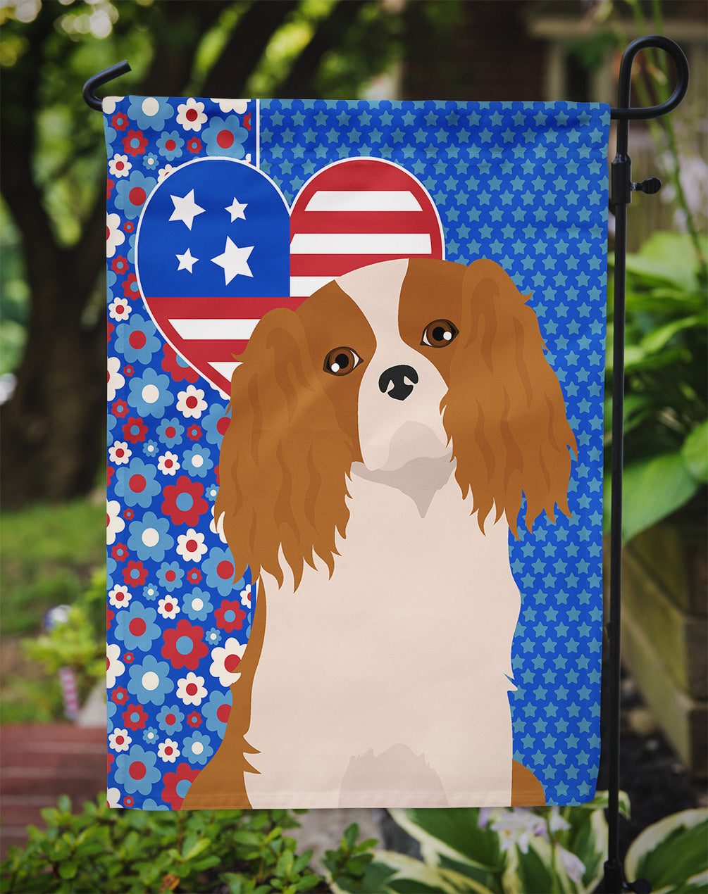 Shown here is the Blenheim Cavalier Spaniel USA American Garden Flag from Caroline's Treasures featuring artwork of a Cavalier King Charles Spaniel in a 4th of July design. The detailed illustration and vibrant colors make it a standout accent that celebrates both seasonal style for your homet. Celebrate love for country and home with our USA Love America Collection. Featuring patriotic designs inspired by red, white, and blue traditions, this collection brings heartfelt American spirit and timeless style to home d�cor and meaningful gifts. Enhance the beauty of your garden, patio, or yard with Caroline's Treasures Decorative Garden Flag, proudly made in the USA. Crafted from two pieces of thick, double-sided polyester fabric, this 2-ply garden flag is designed to withstand various weather conditions, making it water-resistant and weatherproof. Featuring correctly readable words on both sides, this garden flag offers a delightful visual experience from any angle. With its heavier weight, it stands out among other garden flags, ensuring stability and durability even in wind, rain, and snow. Measuring approximately 11 1/4 inches by 15 1/2 inches, this flag allows you to personalize your outdoor decor. It comes with a 1 1/2-inch sleeve sewn in, allowing easy attachment to any standard garden flag stand or garden size porch hanger (sold separately). Make a statement in your outdoor space with Caroline's Treasures Decorative Garden Flag, a vibrant and high-quality flag that adds color and personality to your surroundings. Proudly made in the USA, it's a symbol of quality craftsmanship and attention to detail. Cavalier King Charles Spaniels, often called Cavaliers, are affectionate companion dogs known for their gentle temperament. This breed is cherished for its loving nature, expressive eyes, and devotion to family. Perfect for: Front porches, gardens, yards, patios, 4th of July decorating, Dogs-themed homes, or year-round display for Cavalier King Charles Spaniel enthusiasts Makes a heartfelt gift for: Cavalier King Charles Spaniel owners, Dogs lovers, 4th of July gifts, pet parents, friends who adore their Cavalier King Charles Spaniel, or anyone celebrating Dogs.