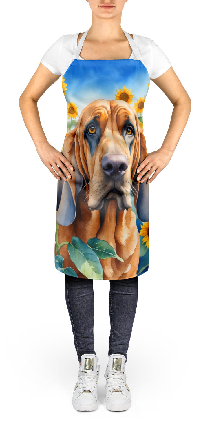 Shown here is the Bloodhound in Sunflowers Apron from Caroline's Treasures featuring artwork of a Bloodhound in a Summer design. The detailed illustration and vibrant colors make it a standout accent that celebrates both seasonal style for you home. Brighten your space with the warmth and cheer of our In Sunflowers Collection. Featuring sunflower-inspired designs that capture sunny charm and uplifting style, this collection brings bold personality and joyful décor to your home and thoughtful seasonal gifts. Elevate your cooking, baking, and grilling experiences with our versatile Kitchen or BBQ Apron. This Bib Style apron isn't just limited to culinary activities - it also serves as an excellent baking apron, artist apron, server apron, gardening apron, or even a dog grooming apron. The apron showcases vibrant full-color artwork contributed by one of our talented artists, bringing a dash of style to your daily tasks. With dimensions of approximately 27"W x 30"H, it provides ample coverage to protect your clothing from spills and splashes. Our apron is meticulously crafted from 100% Ultra Spun Polyester, known for its durability and lightweight nature. The apron comes with white tie straps, ensuring a comfortable and adjustable fit for all. It's a perfect choice for kitchen apron enthusiasts, whether you are a woman or a man. Designed for easy maintenance, this apron is fully machine washable. The quick-drying polyester material actively reduces staining, keeping your apron looking fresh and new for longer. Our beautifully designed apron isn't just a functional kitchen accessory - it's a fashion statement in the culinary world! Bloodhounds are scent hounds renowned for their exceptional tracking ability and gentle personality. This breed is admired for its determination, loyalty, and calm demeanor. Makes a heartfelt gift for: Bloodhound owners, Dogs lovers, gifts, pet parents, friends who adore their Bloodhound, or anyone celebrating Dogs.
