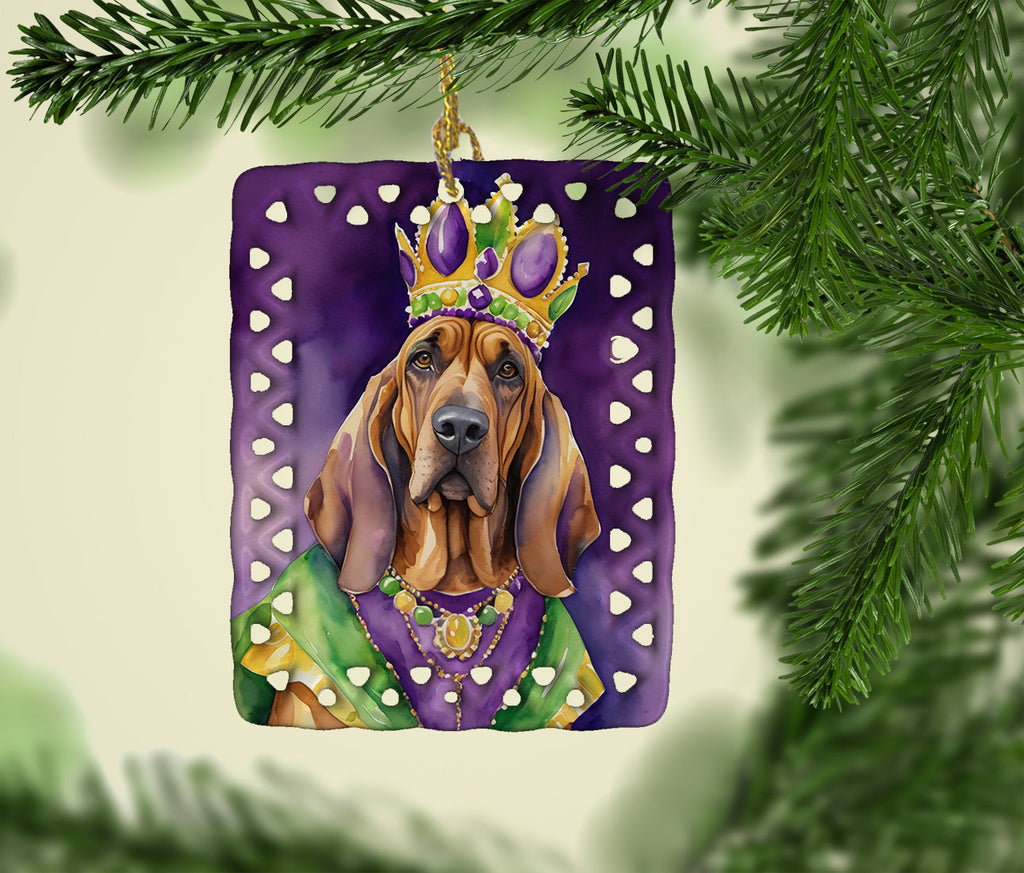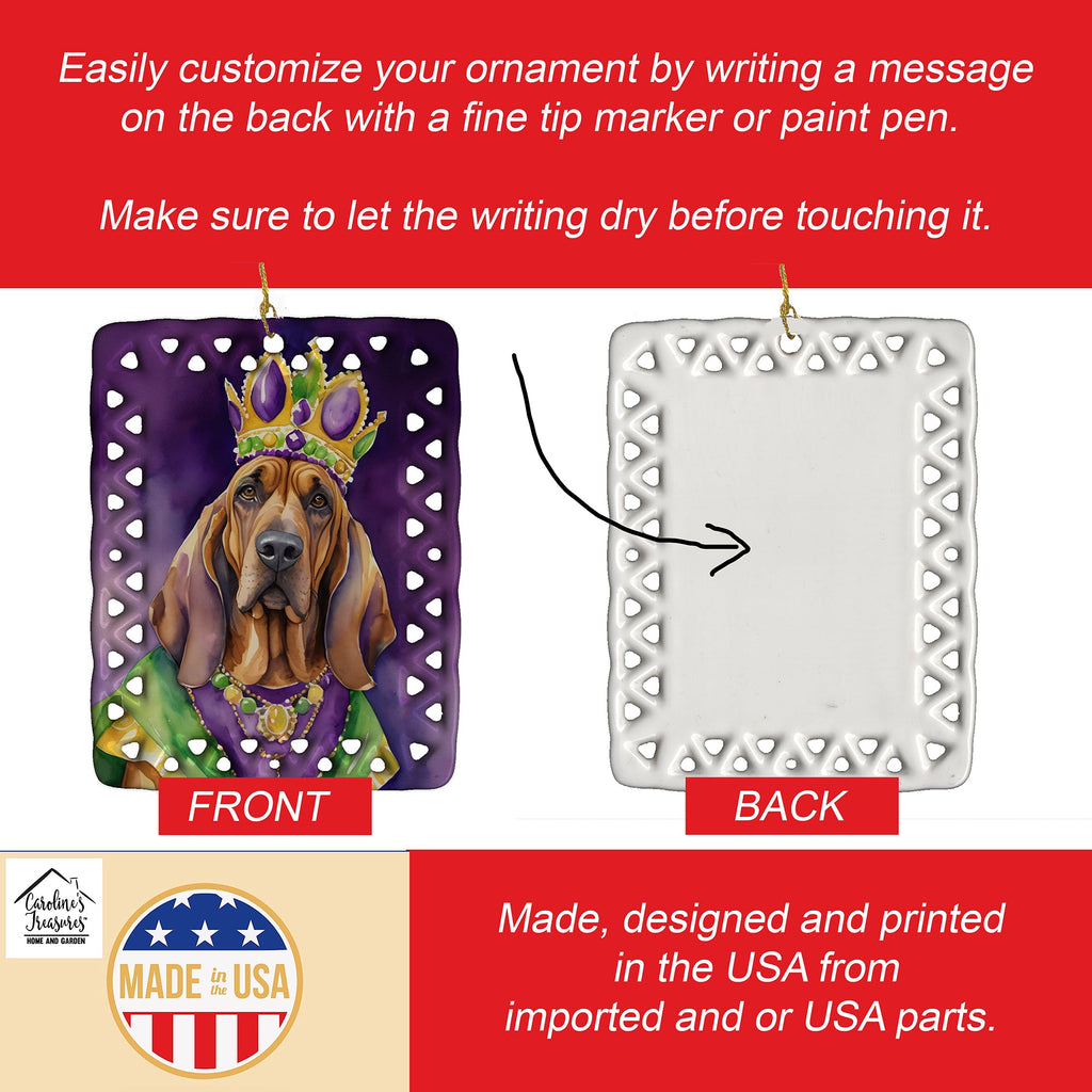 Shown here is the Bloodhound King of Mardi Gras Porcelain Ornament from Caroline's Treasures featuring artwork of a Bloodhound in a Mardi Gras design. The detailed illustration and vibrant colors make it a standout accent for your home. Bring the vibrant spirit of celebration to your décor with our King of Mardi Gras Collection. Featuring bold, festive designs inspired by Mardi Gras colors and culture, this collection adds playful personality and lively flair to home décor and thoughtful seasonal gifts. Add a unique, personal touch to your holiday decor with our Rectangular Lattice Porcelain Ornament. Perfect for creating cherished memories, this high-quality ornament shines under festive lights, reflecting warmth and joy throughout your Christmas tree. Crafted with a glossy finish, it showcases vibrant, full-color artwork contributed by our talented artists, ensuring your tree is adorned with a burst of color and holiday spirit. What sets this Porcelain Ornament apart is its customizable white back. Use a paint pen or permanent marker to write a heartfelt message, commemorate a special year, or mark an unforgettable date, turning this ornament into a keepsake that will be treasured for years to come. For best results, allow any personalization to dry thoroughly before handling. Each ornament comes complete with a delicate gold cord, making it easy to hang and display. Proudly made in the USA, this ornament measures 3.375 x 2.625 inches and is a thoughtful gift for pet sitters, teachers, family members, or anyone who would appreciate a little extra holiday magic. Bring style, charm, and a touch of personal meaning to your Christmas tree with this beautifully designed ornament.. Bloodhounds are scent hounds renowned for their exceptional tracking ability and gentle personality. This breed is admired for its determination, loyalty, and calm demeanor. Perfect for: Christmas trees, wreaths, garlands, and holiday displays, festive seasonal decorating, Dogs-themed holiday homes, or year-after-year use for Bloodhound enthusiasts. Makes a heartfelt gift for: Bloodhound owners, Dogs lovers, Mardi Gras gifts, pet parents, friends who adore their Bloodhound, or anyone celebrating Dogs.