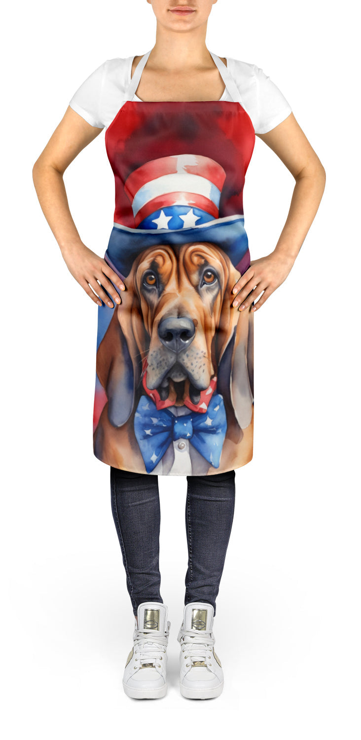 Shown here is the Bloodhound Patriotic American Apron from Caroline's Treasures featuring artwork of a Bloodhound in a 4th of July design. The detailed illustration and vibrant colors make it a standout accent that celebrates both seasonal style for your homet. Celebrate freedom and pride with our Patriotic American Collection. Featuring bold red, white, and blue designs inspired by classic American spirit, this collection brings heartfelt style and spirited charm to home décor and thoughtful gifts for dog lovers and patriotic homes. Elevate your cooking, baking, and grilling experiences with our versatile Kitchen or BBQ Apron. This Bib Style apron isn't just limited to culinary activities - it also serves as an excellent baking apron, artist apron, server apron, gardening apron, or even a dog grooming apron. The apron showcases vibrant full-color artwork contributed by one of our talented artists, bringing a dash of style to your daily tasks. With dimensions of approximately 27"W x 30"H, it provides ample coverage to protect your clothing from spills and splashes. Our apron is meticulously crafted from 100% Ultra Spun Polyester, known for its durability and lightweight nature. The apron comes with white tie straps, ensuring a comfortable and adjustable fit for all. It's a perfect choice for kitchen apron enthusiasts, whether you are a woman or a man. Designed for easy maintenance, this apron is fully machine washable. The quick-drying polyester material actively reduces staining, keeping your apron looking fresh and new for longer. Our beautifully designed apron isn't just a functional kitchen accessory - it's a fashion statement in the culinary world! Bloodhounds are scent hounds renowned for their exceptional tracking ability and gentle personality. This breed is admired for its determination, loyalty, and calm demeanor. Makes a heartfelt gift for: Bloodhound owners, Dogs lovers, 4th of July gifts, pet parents, friends who adore their Bloodhound, or anyone celebrating Dogs.