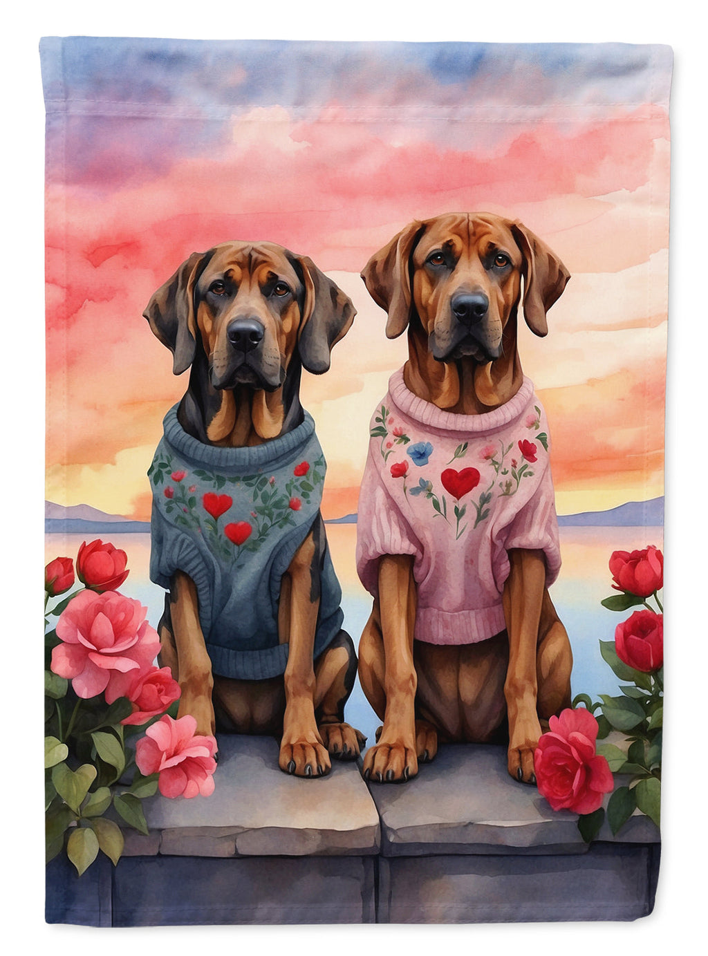 Bloodhound Two Hearts Garden Flag – Romantic Dog Pair with Sunset & Mountain Background