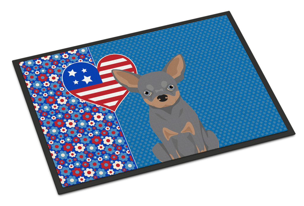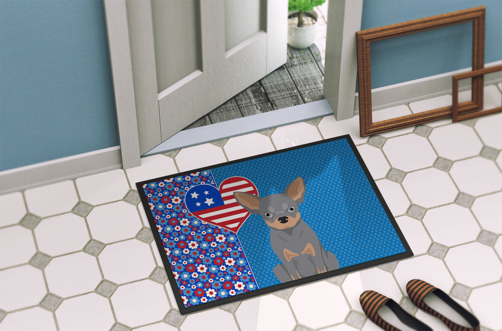 Shown here is the Blue and Tan Chihuahua USA American Doormat from Caroline's Treasures featuring artwork of a Chihuahua in a 4th of July design. The detailed illustration and vibrant colors make it a standout accent that celebrates both seasonal style for your homet. Celebrate love for country and home with our USA Love America Collection. Featuring patriotic designs inspired by red, white, and blue traditions, this collection brings heartfelt American spirit and timeless style to home d�cor and meaningful gifts. Welcome your guests in style with our Artwork Door Mat, designed to withstand almost any weather condition. This mat, measuring approximately 24 by 36 inches, is held together by durable black binding tape. Its top layer, composed of polyester felt, is dyed with the eye-catching image you see on the mat. A few layers below provide the mat with stability, while its rubber bottom is stamped to help prevent slipping and ensures safety. Our mat works wonderfully as both an indoor or outdoor door mat. For cleaning, simply hose it off with water or use a power washer - no need for any cleaner that produces suds. Avoid scrubbing with a brush, instead, opt for the vacuum on floor setting. Designed manufactured and printed in the USA, this mat is a perfect addition to your porch, outdoor kitchen, entryway, or any indoor space. Its unique design makes it a charming decorative rug that greets your guests and adds a stylish touch to your home decor. Chihuahuas are small companion dogs known for their bold personality and strong attachment to their owners. Despite their size, this breed is admired for its confidence, loyalty, and alert nature. Perfect for: Front doors, entryways, and porches, everyday home d�cor, Dogs-themed homes, or year-round display for Chihuahua lovers. Makes a heartfelt gift for: Chihuahua owners, Dogs lovers, 4th of July gifts, pet parents, friends who adore their Chihuahua, or anyone celebrating Dogs.