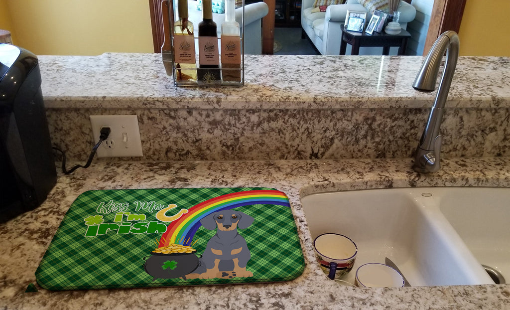 Shown here is the Blue and Tan Dachshund St. Patrick's Day Dish Drying Mat from Caroline's Treasures featuring artwork of a Dachshund in a St Patrick's Day design. The detailed illustration and vibrant colors make it a standout accent for your home. Say goodbye to messy countertops and soggy dish towels with our innovative dish drying mat. Our high-quality dish drying pad is designed to keep your countertops dry while offering a stylish and efficient solution. Whether you're air drying dishes, glasses, stemware, silverware, pots, pans, bottles, or even fruits and vegetables, our dish mat is the perfect choice. The 14 inches x 22 inches size fits most counters and dish drying racks, and the non-slip design ensures stability. Made with water-absorbent polyester and a polyurethane foam insert, our dish drying mat is not only functional but also durable. It's machine washable and printed in the USA for long-lasting use. The beautiful artwork adds flair to your kitchen decor, making it a perfect housewarming gift or present for any occasion. Upgrade your kitchen experience with our absorbent and versatile dish drying mat. Dachshunds are bold hounds known for their long bodies and confident personality. Often called wiener dogs, this breed is loved for its loyalty, courage, and playful spirit. Perfect for: Kitchen counters and sinks, everyday dish drying and countertop protection, Dogs-themed homes, or year-round use for Dachshund lovers. Makes a heartfelt gift for: Dachshund owners, Dogs lovers, St Patrick's Day gifts, pet parents, friends who adore their Dachshund, or anyone celebrating Dogs.
