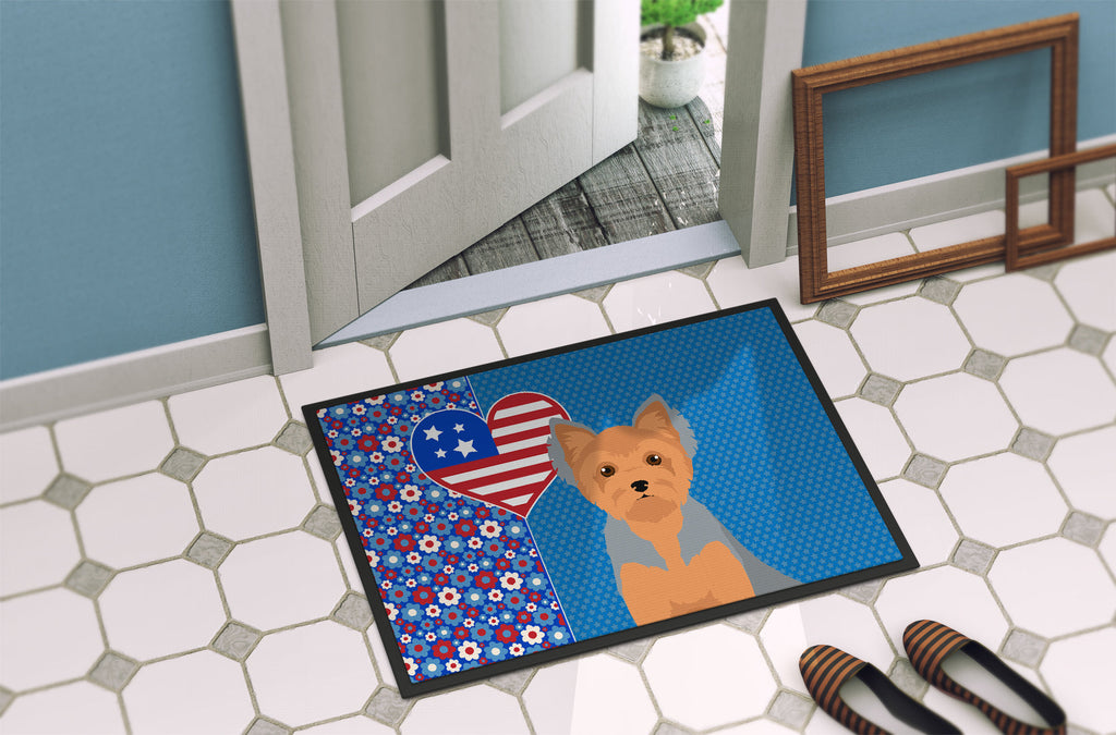 Shown here is the Blue and Tan Puppy Cut Yorkshire Terrier USA American Doormat from Caroline's Treasures featuring artwork of a Yorkshire Terrier in a 4th of July design. The detailed illustration and vibrant colors make it a standout accent that celebrates both seasonal style for your homet. Celebrate love for country and home with our USA Love America Collection. Featuring patriotic designs inspired by red, white, and blue traditions, this collection brings heartfelt American spirit and timeless style to home d�cor and meaningful gifts. Welcome your guests in style with our Artwork Door Mat, designed to withstand almost any weather condition. This mat, measuring approximately 24 by 36 inches, is held together by durable black binding tape. Its top layer, composed of polyester felt, is dyed with the eye-catching image you see on the mat. A few layers below provide the mat with stability, while its rubber bottom is stamped to help prevent slipping and ensures safety. Our mat works wonderfully as both an indoor or outdoor door mat. For cleaning, simply hose it off with water or use a power washer - no need for any cleaner that produces suds. Avoid scrubbing with a brush, instead, opt for the vacuum on floor setting. Designed manufactured and printed in the USA, this mat is a perfect addition to your porch, outdoor kitchen, entryway, or any indoor space. Its unique design makes it a charming decorative rug that greets your guests and adds a stylish touch to your home decor. Yorkshire Terriers, often called Yorkies, are small companion dogs known for their confident personality and silky coats. This breed is cherished for its loyalty, intelligence, and spirited nature. Perfect for: Front doors, entryways, and porches, everyday home d�cor, Dogs-themed homes, or year-round display for Yorkshire Terrier lovers. Makes a heartfelt gift for: Yorkshire Terrier owners, Dogs lovers, 4th of July gifts, pet parents, friends who adore their Yorkshire Terrier, or anyone celebrating Dogs.