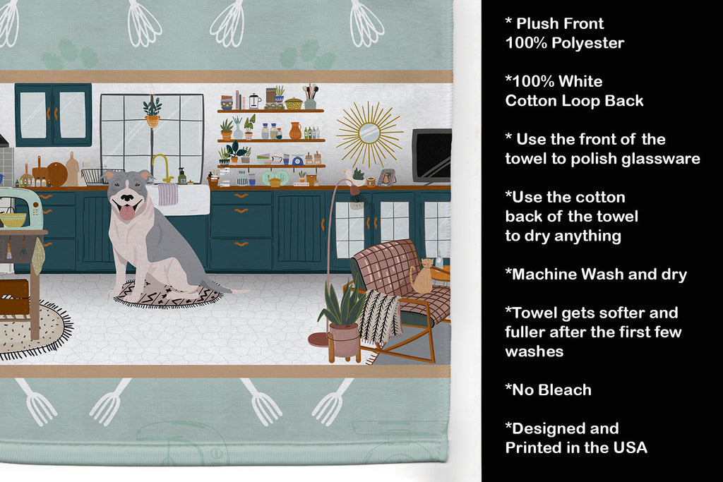 Shown here is the Blue and White Pit Bull Terrier in the Kitchen Kitchen Towel from Caroline's Treasures featuring artwork of a Pit Bull Terrier in a Everyday design. The detailed illustration and vibrant colors make it a standout accent for your home. Bring cozy everyday charm to your sink or powder room with a plush velour towel featuring original watercolor artwork. The front is a soft, color-rich minky polyester that polishes glassware to a brilliant shine; the back is 100% white cotton terry loop for quick absorbency on hands, dishes, and counters. Artwork is dyed into the fibers for lasting color that won�t crack or peel. Finished edges keep the shape wash after wash. Size: 15" x 25". Machine wash; tumble dry low. Designed and printed in the USA. Pit Bull Terriers are muscular dogs with confident posture. Their appearance reflects strength and loyalty. Perfect for: Kitchen counters, ovens, and towel bars, everyday drying and cleanup, Dogs-themed kitchens, or year-round use for Pit Bull Terrier lovers. Makes a heartfelt gift for: Pit Bull Terrier owners, Dogs lovers, Everyday gifts, pet parents, friends who adore their Pit Bull Terrier, or anyone celebrating Dogs.