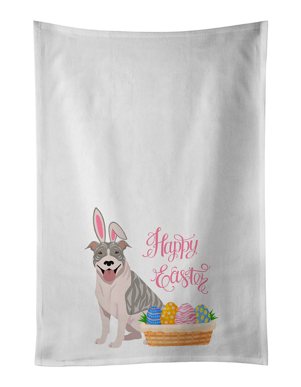 Shown here is the Blue Brindle Pit Bull Terrier Easter Kitchen Towel Set of 2 from Caroline's Treasures featuring artwork of a Pit Bull Terrier in a Easter design. The detailed illustration and vibrant colors make it a standout accent for your home. Spruce up your kitchen decor with Caroline's Treasures Decorative White Kitchen Towel Set. This set of two dish towels showcases beautiful artwork from one of our talented artists, making them both practical and visually appealing. These towels are crafted from 100% cotton, offering excellent absorbency and durability, making them ideal for any kitchen task. Each white towel measures 19 inches by 28 inches, providing ample coverage for drying dishes or wiping up spills. The standout feature of these towels is the full-color artwork design printed on each one. They can serve as a vibrant accent in your kitchen, turning a functional item into a delightful piece of decor. When it comes to care, these towels are machine washable in cold water and can be dried on low heat. Remember to always use a pressing cloth when pressing the design, and avoid using bleach on the decorated towel. The Decorative White Kitchen Towel Set makes a great gift or a stylish addition to your own kitchen. Pit Bull Terriers are muscular dogs with confident posture. Their appearance reflects strength and loyalty. Makes a heartfelt gift for: Pit Bull Terrier owners, Dogs lovers, Easter gifts, pet parents, friends who adore their Pit Bull Terrier, or anyone celebrating Dogs.